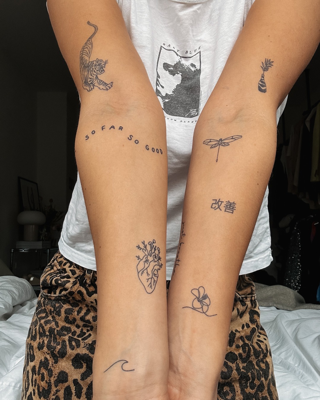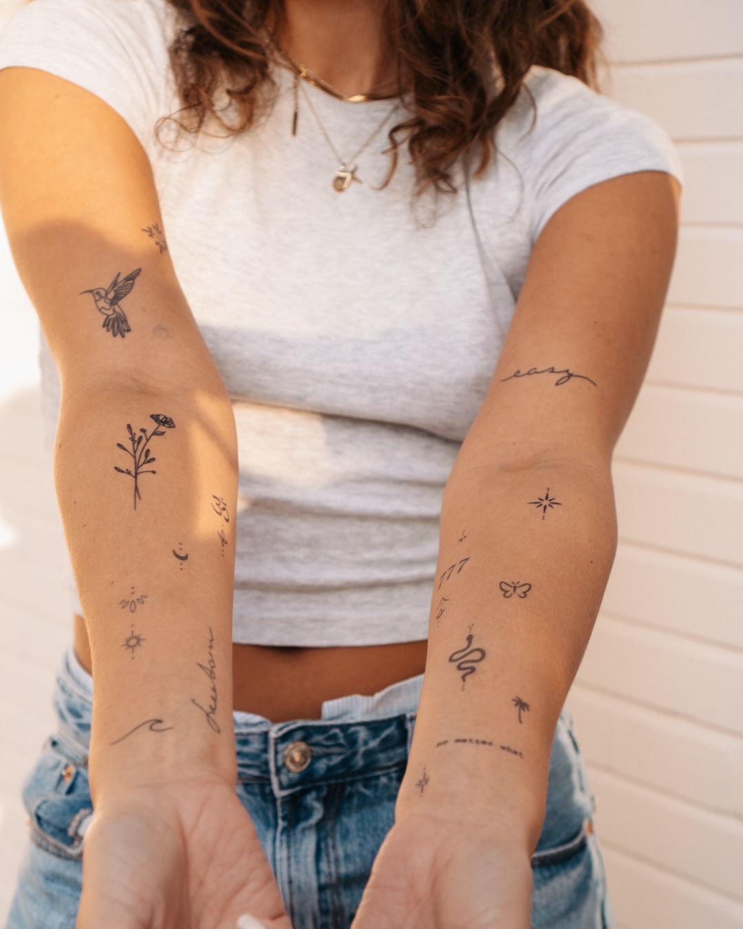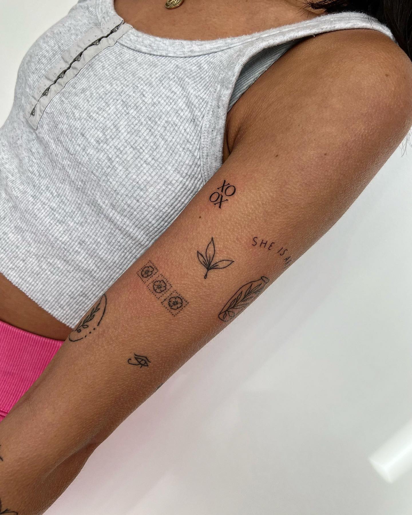This tattoo showcases a delightful mix of tiny designs, each telling its own unique story. From a graceful flower to playful symbols, the variety creates a fun and personal tapestry on the skin. When choosing tattoos, consider how each design reflects moments or feelings that are special to you.