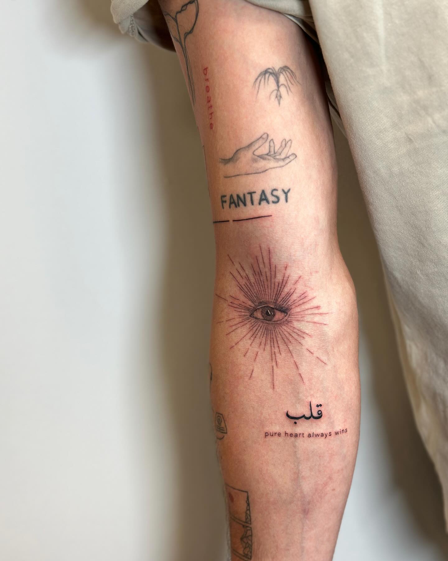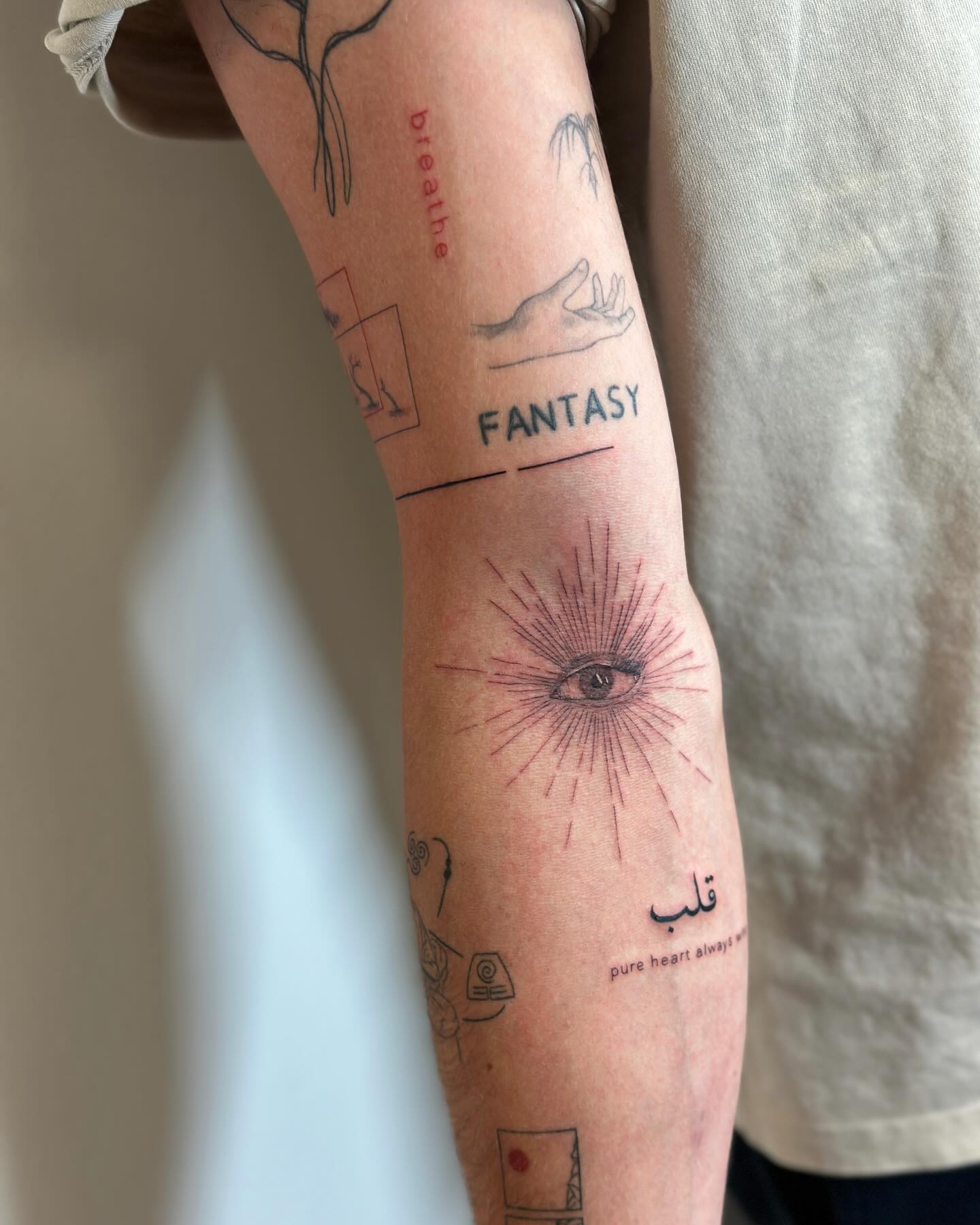 This image showcases a vibrant combination of tattoos that tell a unique story on the skin. Each design, from the eye radiating light to the meaningful words, adds depth and character, creating a beautiful patchwork of personal expression. When considering a similar style, think about how each piece can reflect your own journey or beliefs.
