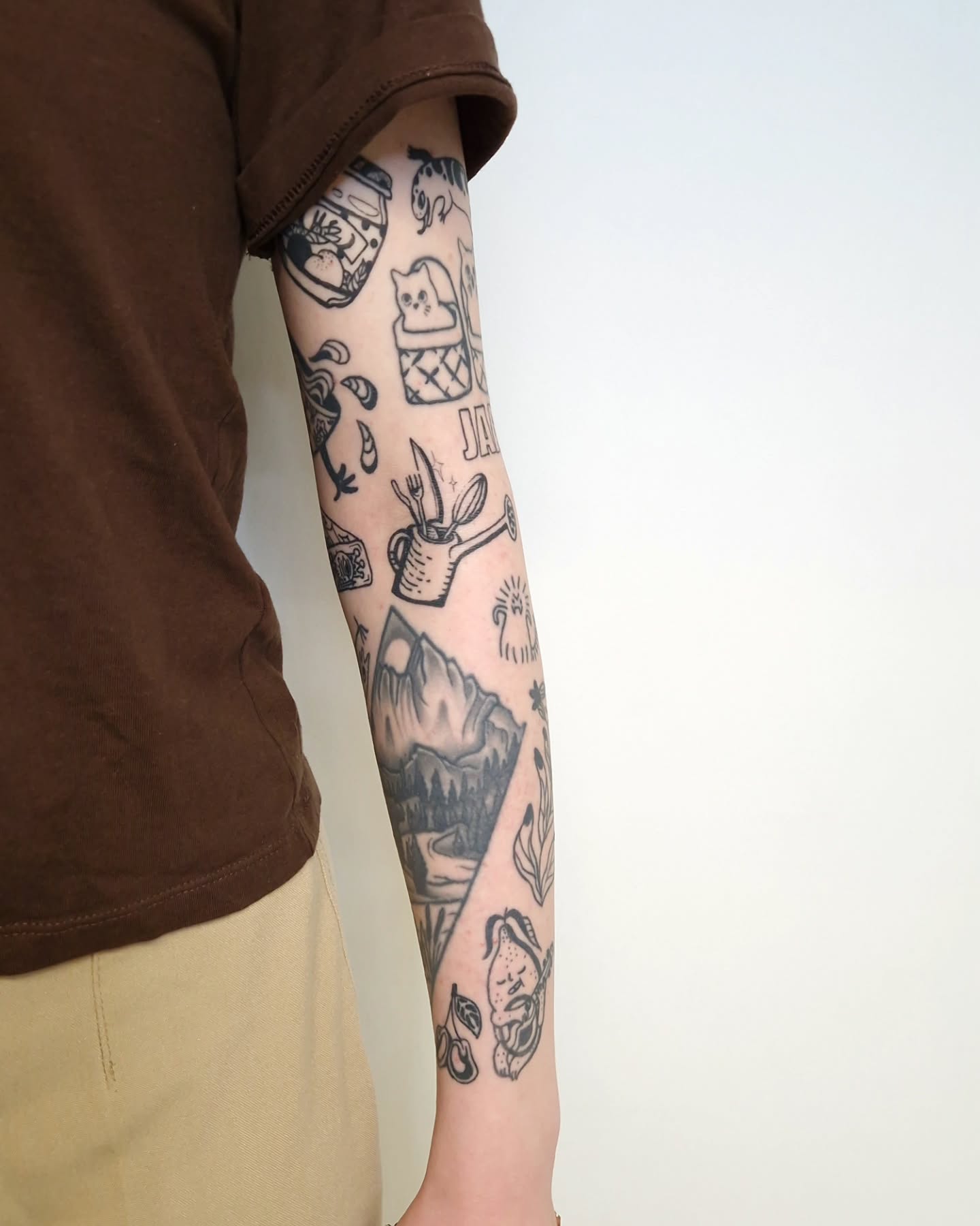 This tattoo showcases a delightful mix of charming designs, from playful teapots to whimsical characters. Each element tells a story, creating a vibrant patchwork of memories and imagination on the wearer s arm. For anyone considering a similar style, think about incorporating personal symbols that reflect your unique experiences.