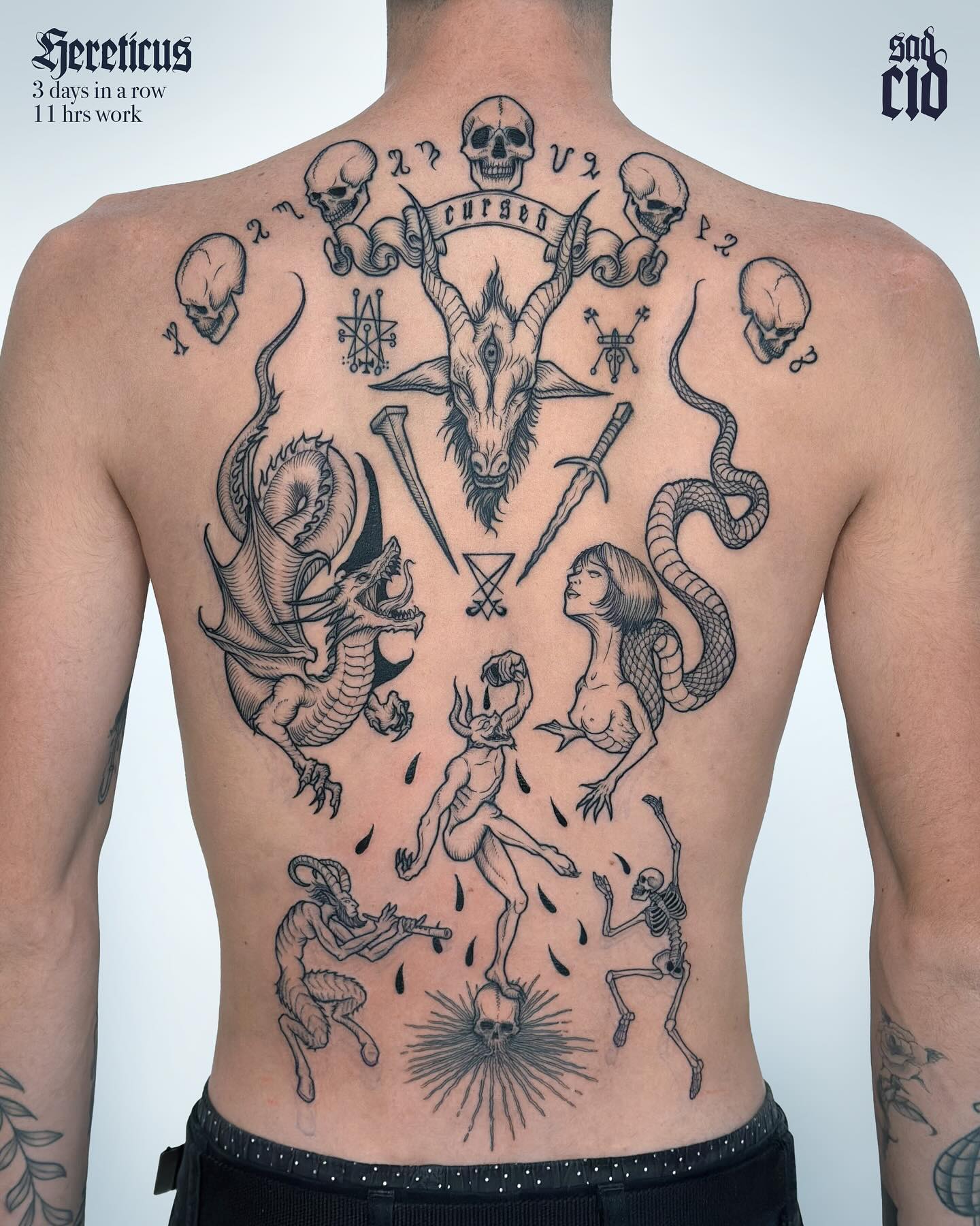 This tattoo design showcases a mesmerizing blend of imagery, featuring skulls, mythical creatures, and striking symbols that draw the eye. Each element tells a unique story, creating a narrative that invites viewers to explore its deeper meanings. For those considering a similar style, think about how each piece can reflect your own experiences and beliefs, making your tattoo truly personal.