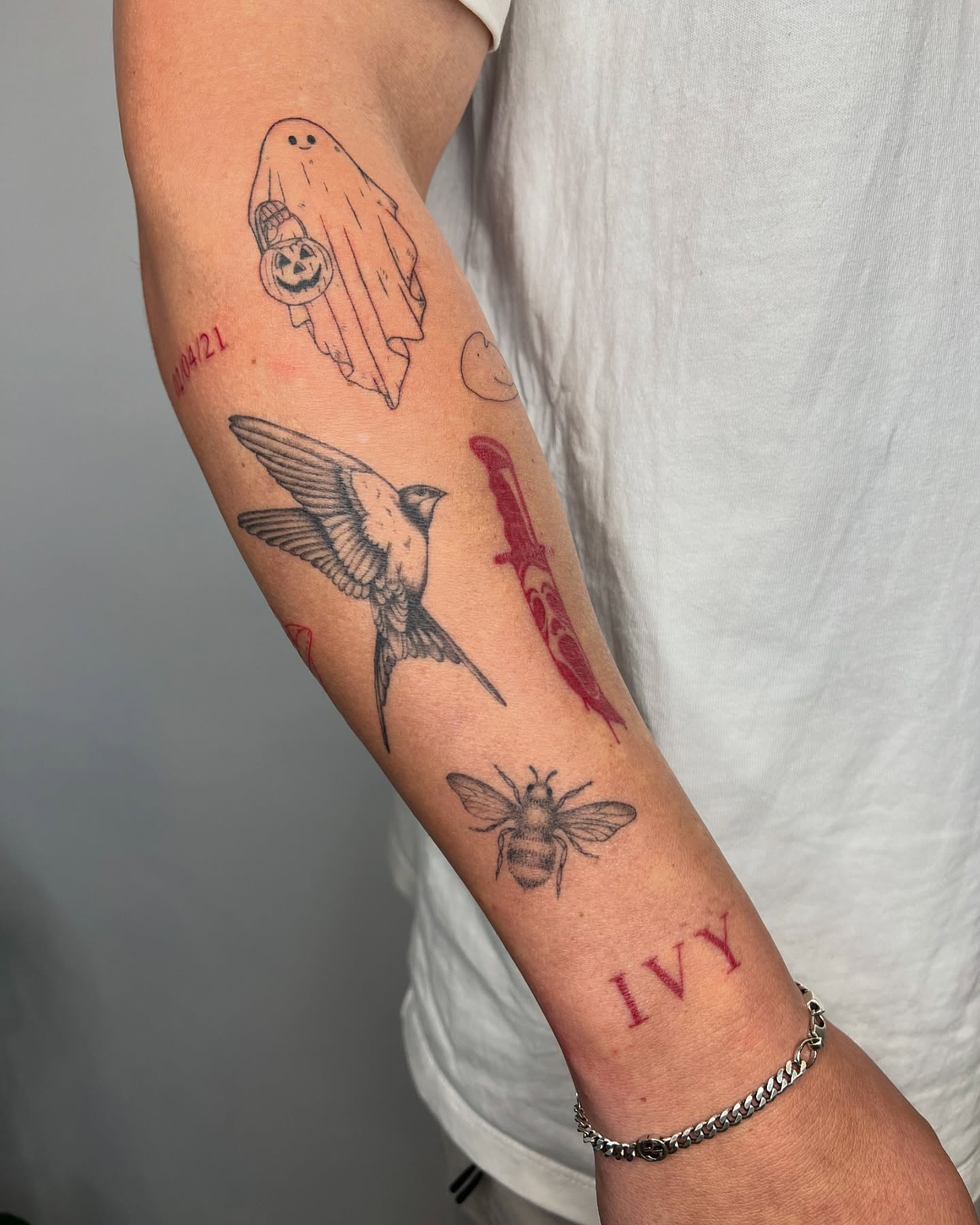 This tattoo showcases a delightful mix of images, each telling a unique story. The playful ghost and the graceful bird stand out, creating a vibrant display on the arm. When considering a patchwork tattoo, think about how each piece can represent different moments or feelings in your life, making your skin a canvas of memories.