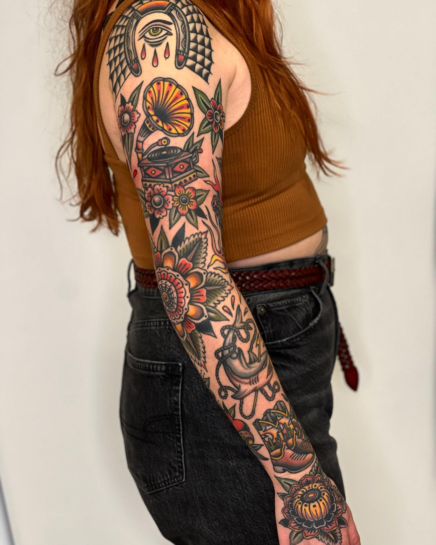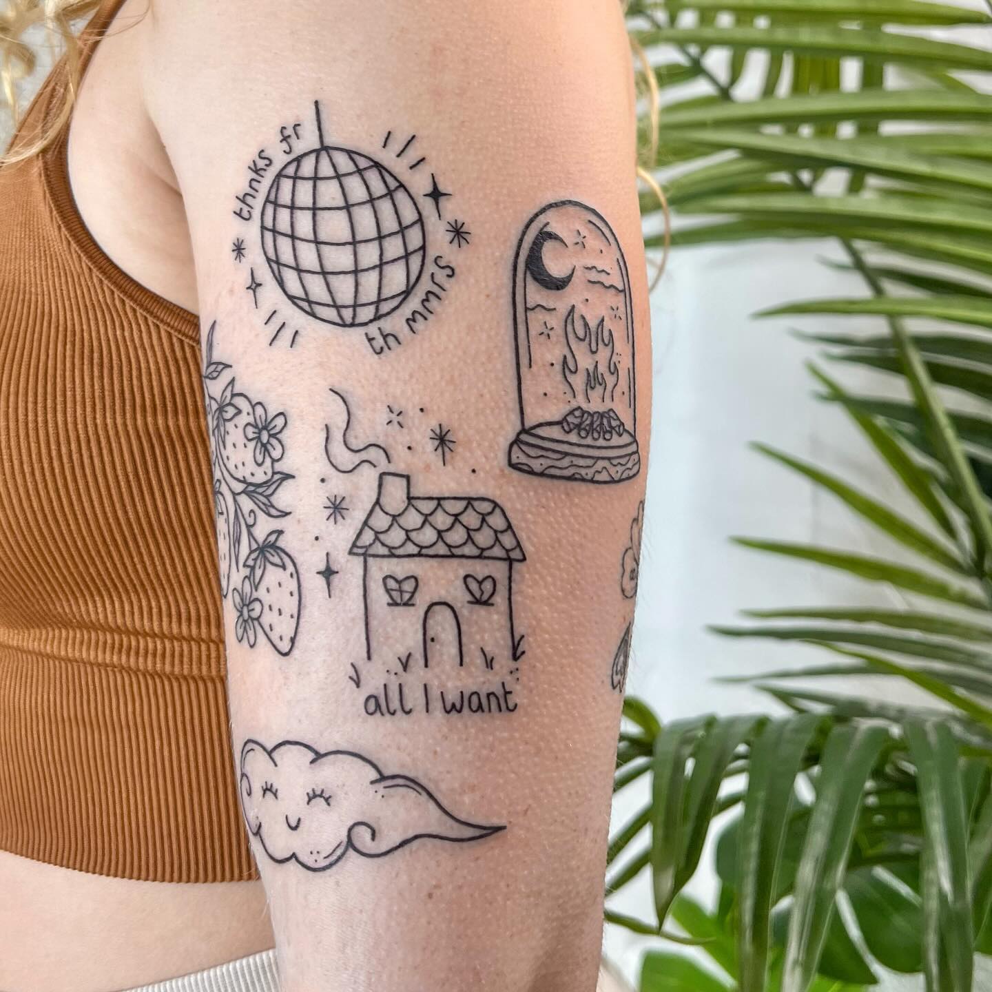 This tattoo sleeve showcases a delightful mix of whimsical designs, from a disco ball to a cozy little house. Each image tells a story, reflecting personal experiences and dreams, making it a unique patchwork of memories. For those considering similar art, choosing symbols that resonate with them can create a meaningful and beautiful collection.
