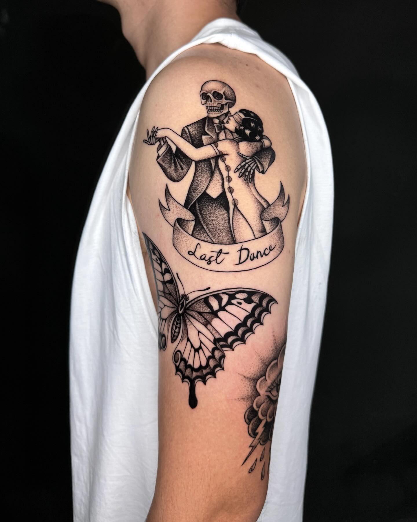 This tattoo showcases a striking scene of a skeleton elegantly dancing with a woman, symbolizing the beautiful balance between life and death. The intricate details of the design, including the flowing banner that reads “Last Dance,” invite viewers to reflect on the joys and sorrows that life brings. For those considering similar tattoos, combining various themes can create a deeply personal story.