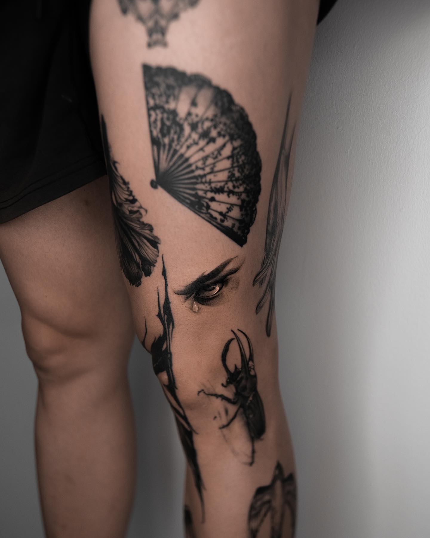 This tattoo showcases a striking blend of images that come together to tell a unique story. The detailed designs, featuring everything from a butterfly to an expressive eye, create a captivating visual narrative that draws the viewer in. When considering a patchwork tattoo, it’s essential to choose elements that reflect personal meaning for a truly special piece.