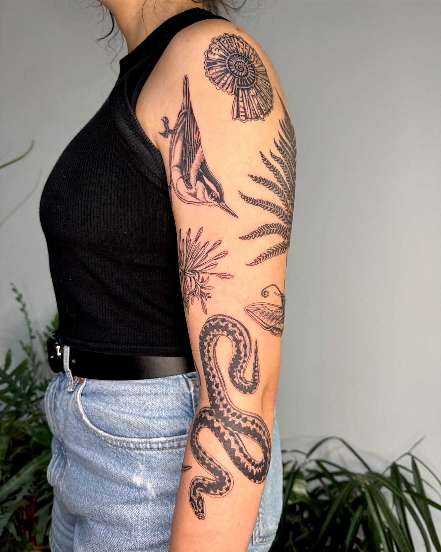 This stunning tattoo showcases a variety of designs, each telling its own story. From the intricate details of the snake to the delicate fern, it beautifully blends elements of nature and wildlife. For those considering patchwork tattoos, choosing meaningful symbols can create a personal masterpiece that reflects your unique journey.