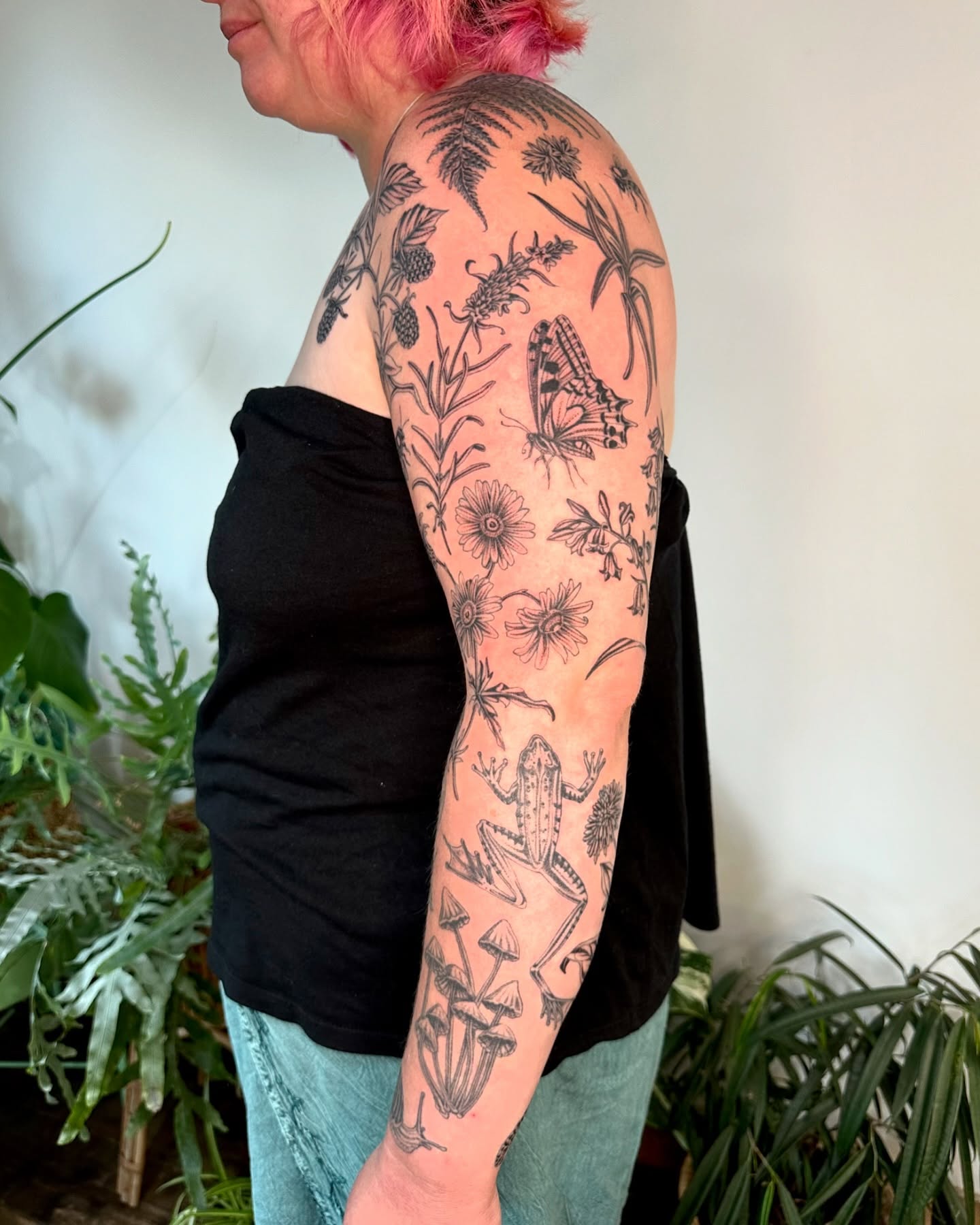 This stunning tattoo showcases a vibrant collection of flora and fauna, beautifully wrapping around the arm. Each design tells a story, from delicate butterflies to playful frogs, creating a lively connection to nature. When considering a similar piece, think about what elements of nature resonate with you, making your tattoo not just art, but a personal statement.