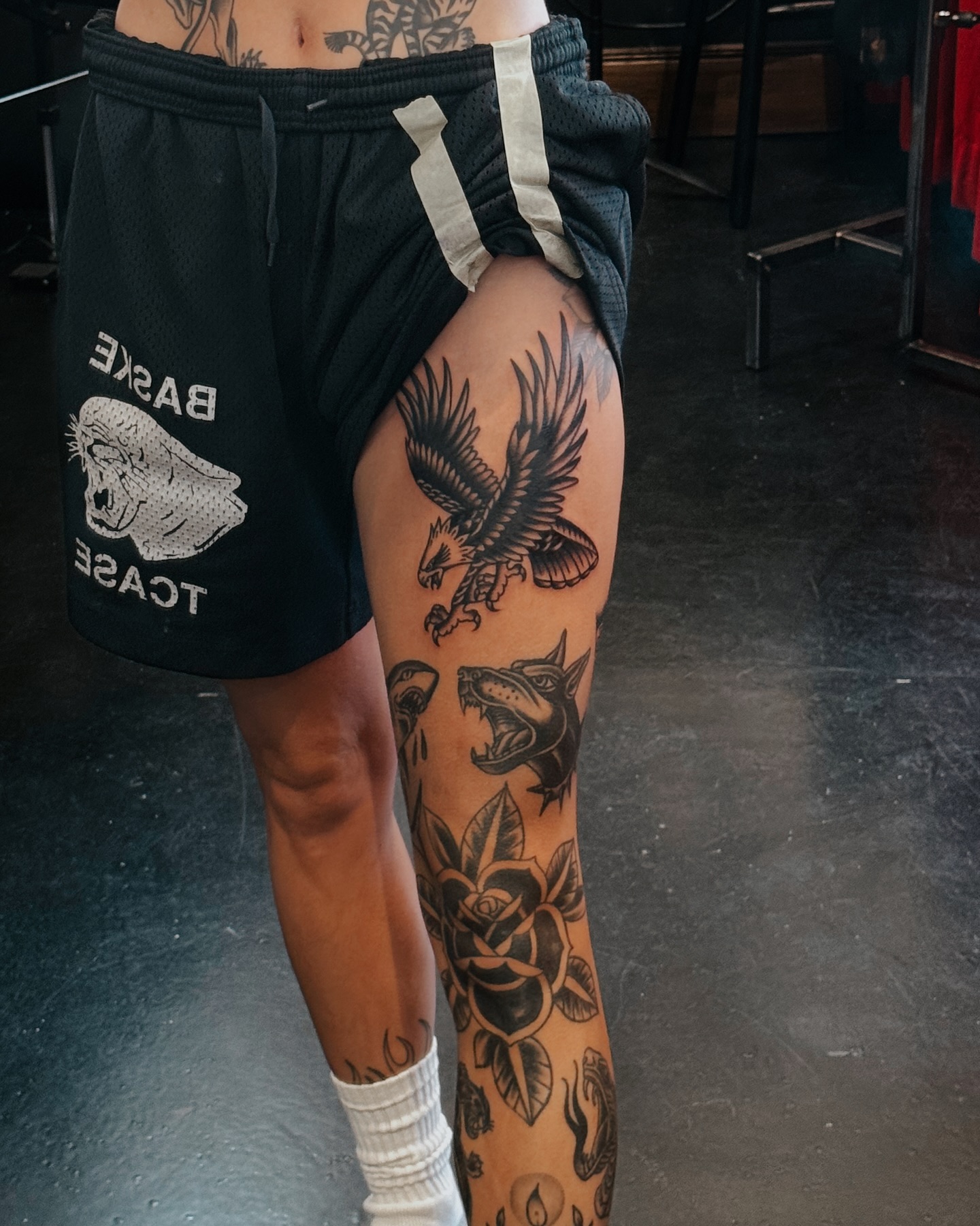 This image showcases a striking display of tattoos that come together like a vibrant storybook on skin. Each design, from the soaring eagle to the elegant roses, tells its own tale while blending beautifully into a patchwork of creativity. For those considering a similar style, think about how each piece can represent a personal memory or passion, making your tattoo truly unique.