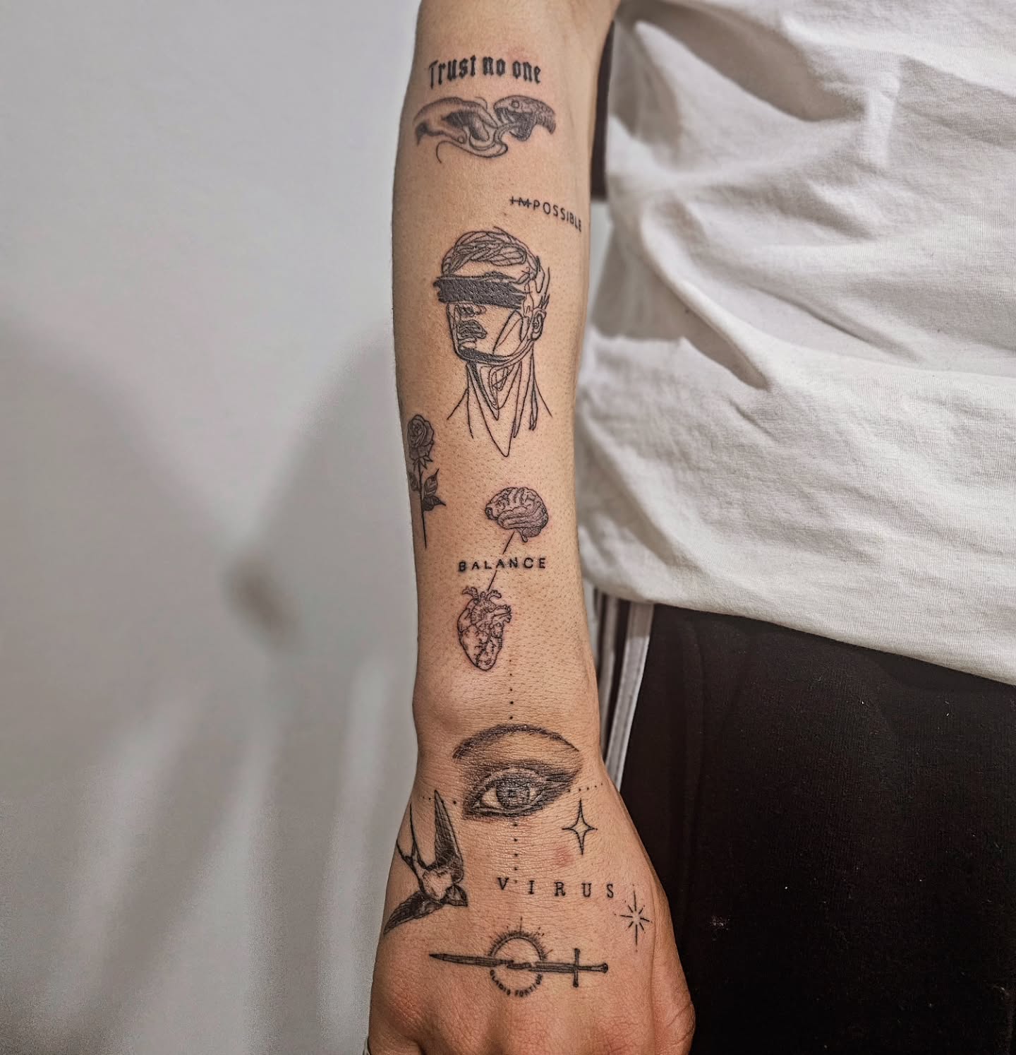 This tattoo design stands out with its collection of unique symbols and phrases, each telling a different story. From the blindfolded figure to the eye, every piece adds depth and meaning, creating a captivating patchwork of personal expression. For those considering a similar style, think about how each element can reflect your own journey and beliefs.