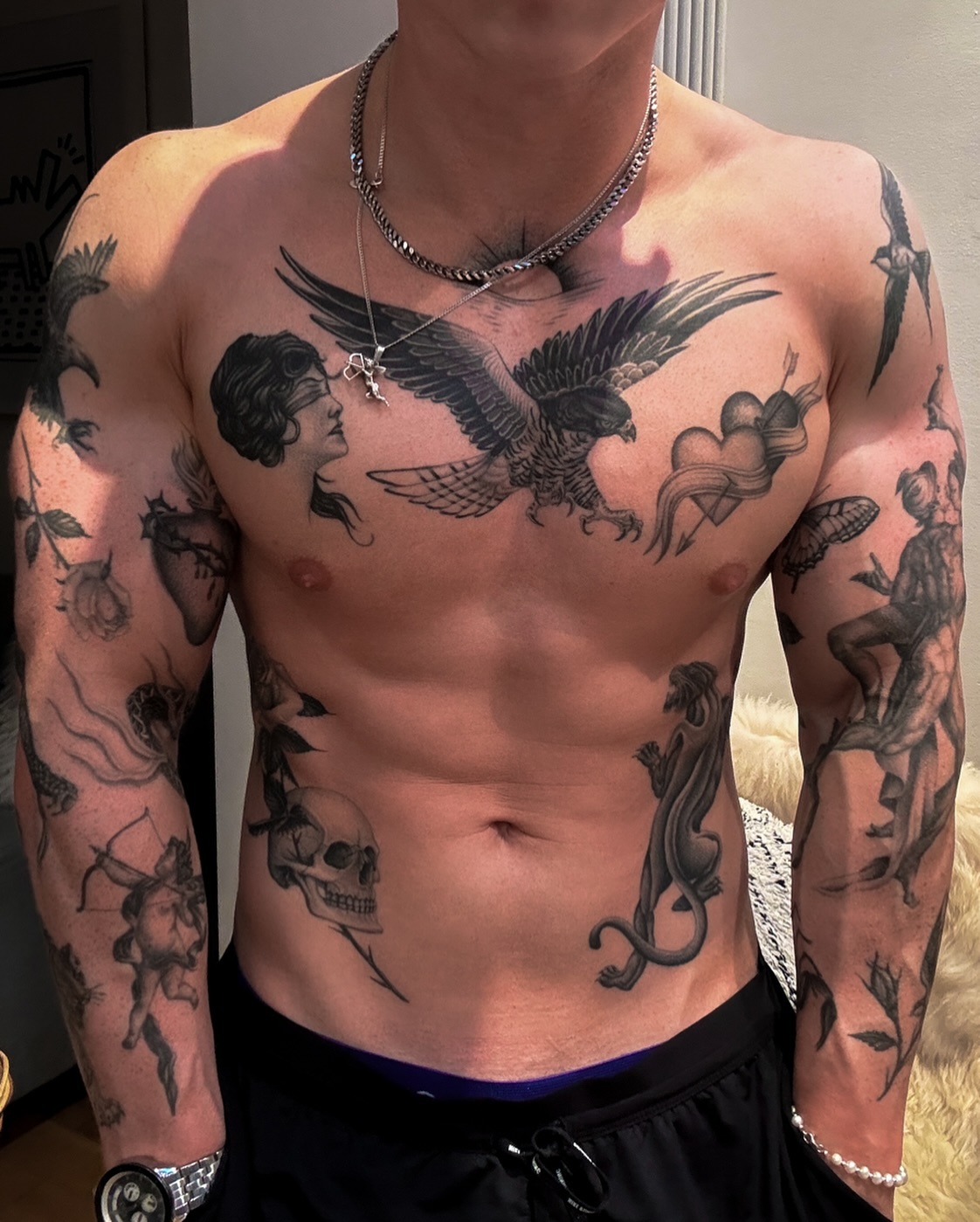 This image showcases a striking blend of tattoo designs that create a captivating collage on the wearer s body. Each piece tells a unique story, from the soaring eagle to the playful cherub, reflecting personal experiences and interests. For those considering a similar style, mixing various designs can lead to a truly one-of-a-kind expression of individuality.