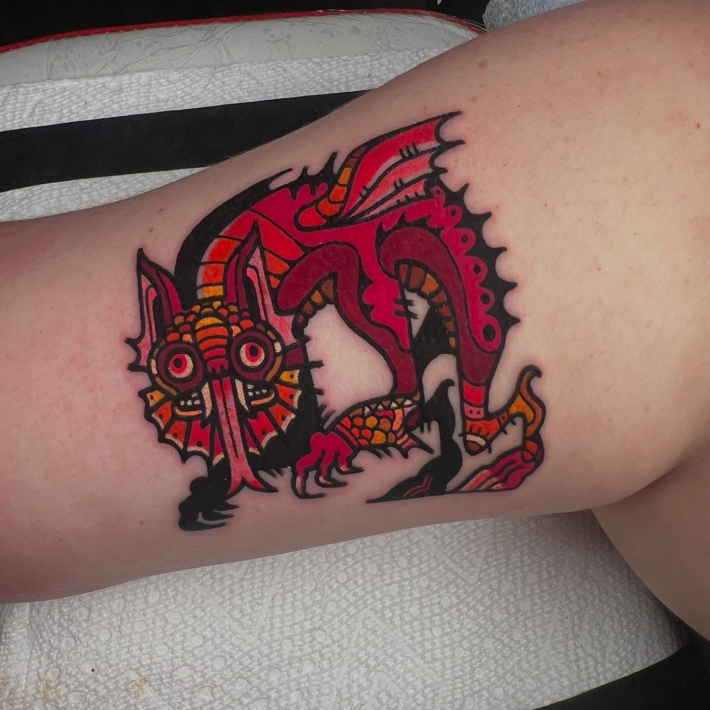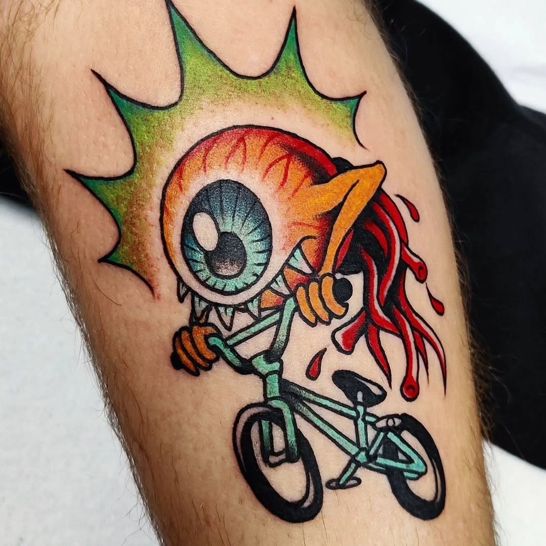 This tattoo features a wild character with a gigantic eye, riding a bike and surrounded by vibrant colors that pop off the skin. It’s a unique blend of whimsy and creativity, showcasing how tattoos can tell fun stories in unexpected ways. For those considering their own ink, think about how your design can reflect your personality or a quirky interest!