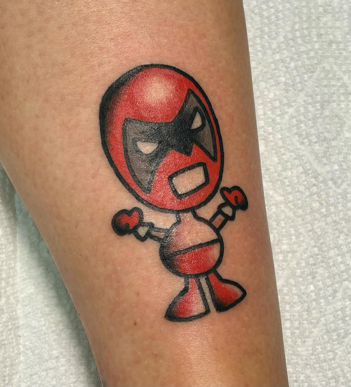 This tattoo features a charming, cartoonish character with a bold red mask and heart-shaped hands, ready to take on the world. It s a fun nod to favorite childhood cartoons, reminding people of the joy and imagination from those days. For anyone considering a similar ink, choosing a design that sparks happiness can make the tattoo even more special.
