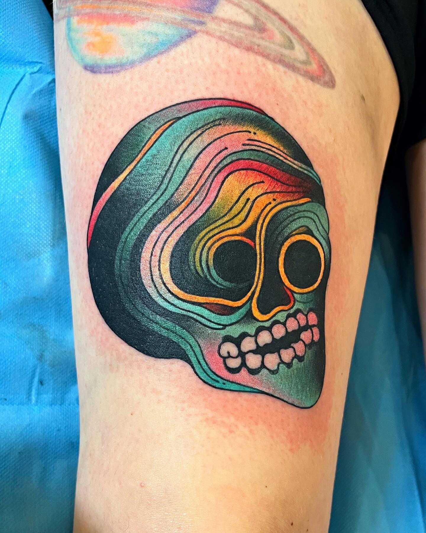 This tattoo features a vibrant skull that looks like it s swirling with cosmic colors. Its unique design blends elements of the universe with a classic skull shape, making it both eye-catching and thought-provoking. For those thinking about weird tattoos, embracing bold colors and unconventional themes can lead to truly memorable body art.