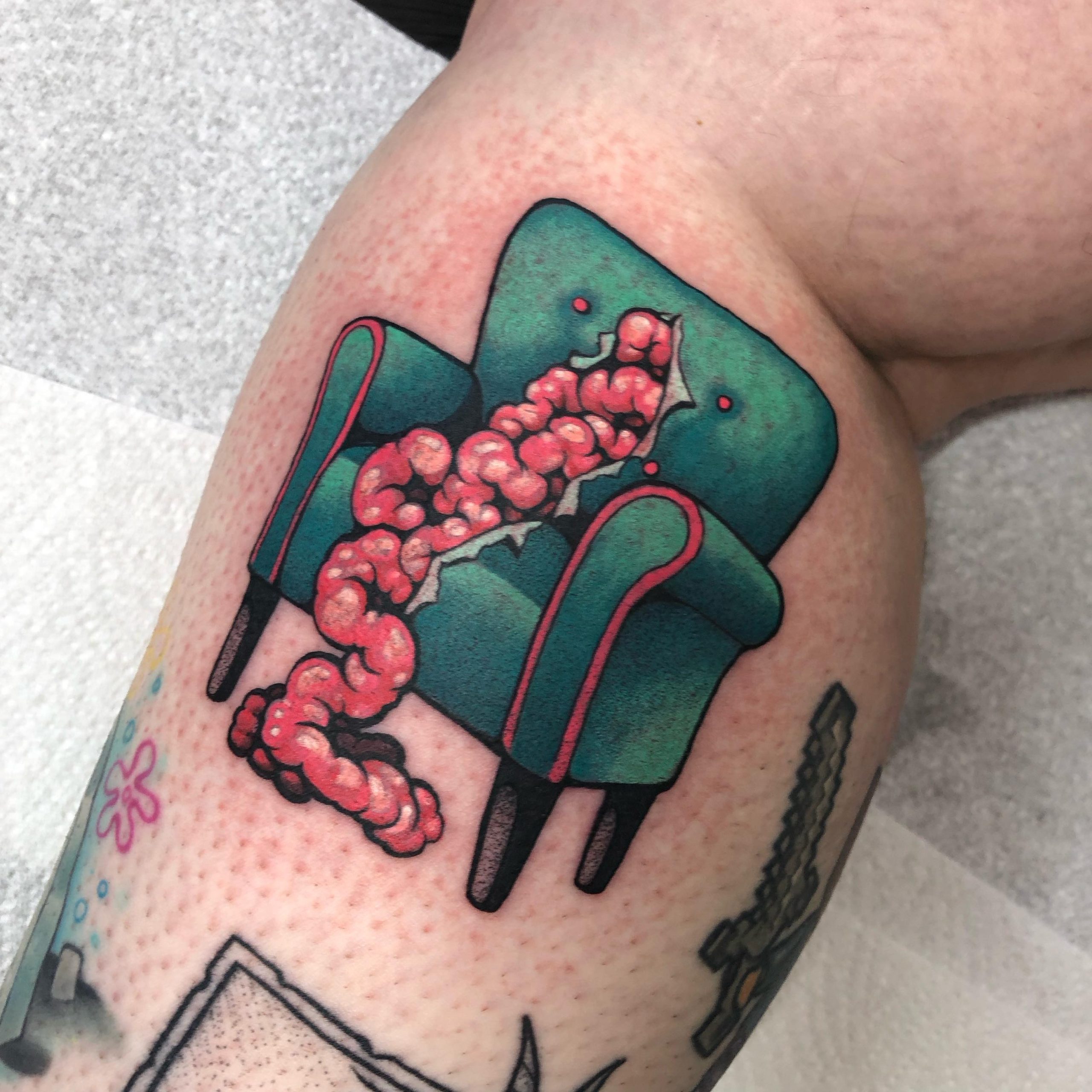 This tattoo features a bright green couch with a whimsical twist it’s bursting with colorful, squiggly shapes as if it’s alive! It s a playful take on furniture, showing how creativity can transform everyday items into something extraordinary. For anyone considering a unique tattoo, think about what ordinary objects mean to you; they can inspire some truly remarkable designs.