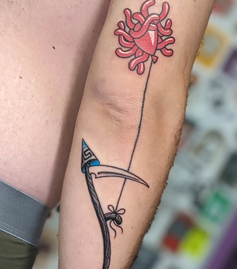 This tattoo features a colorful heart tangled in playful, swirling lines, alongside a striking hook that draws the eye. The combination of these images creates a unique story, suggesting themes of love and the challenges that come with it. For those considering a tattoo, choosing a design that reflects personal experiences can make it even more special.
