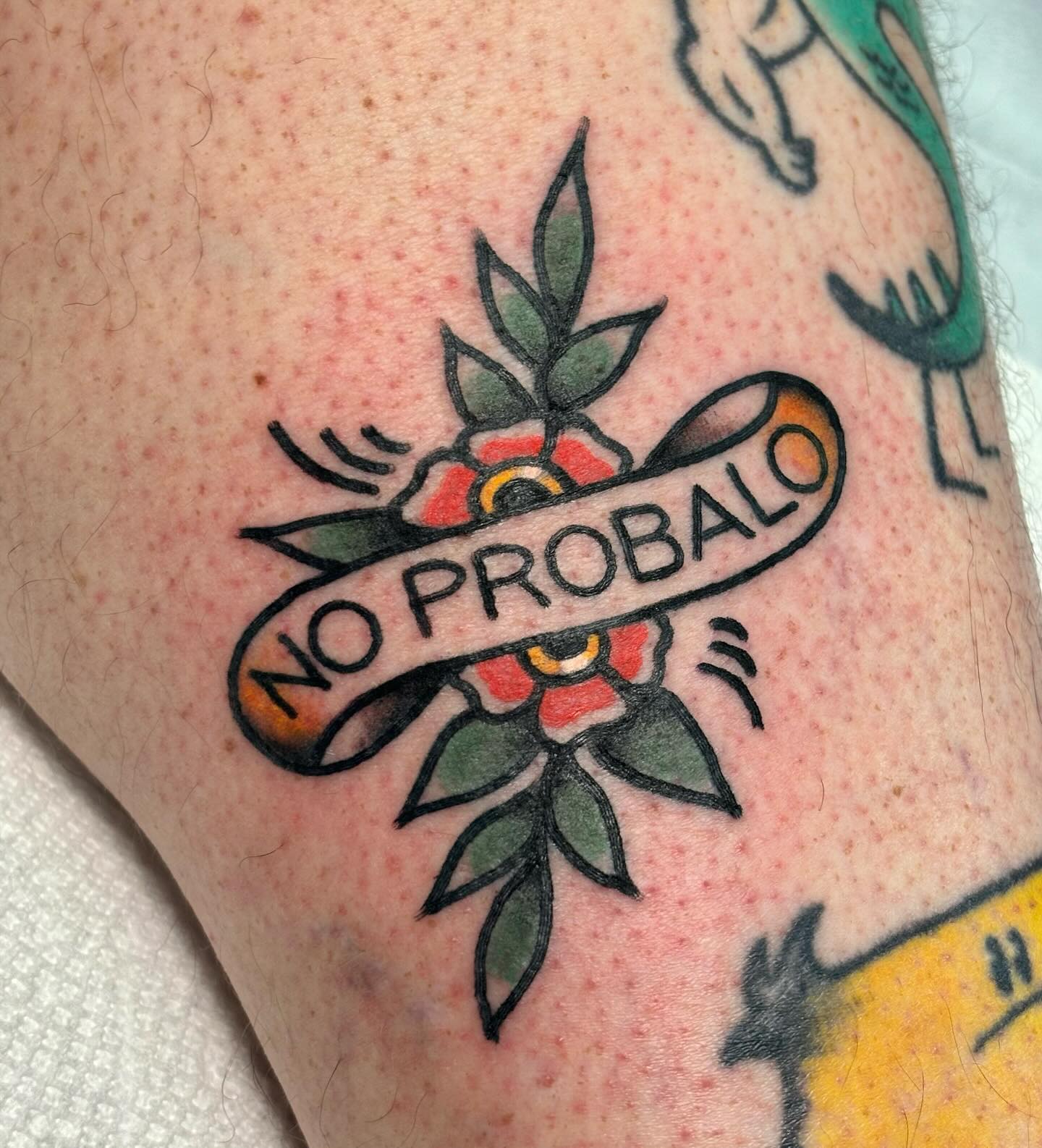 This tattoo stands out with its vibrant flowers and the phrase “No Probalo” wrapped in a banner, giving it a cheerful vibe. It hints at a carefree attitude and a readiness to tackle challenges without worry. For anyone considering a tattoo with a personal message, this design shows that sometimes simplicity can make a powerful statement.