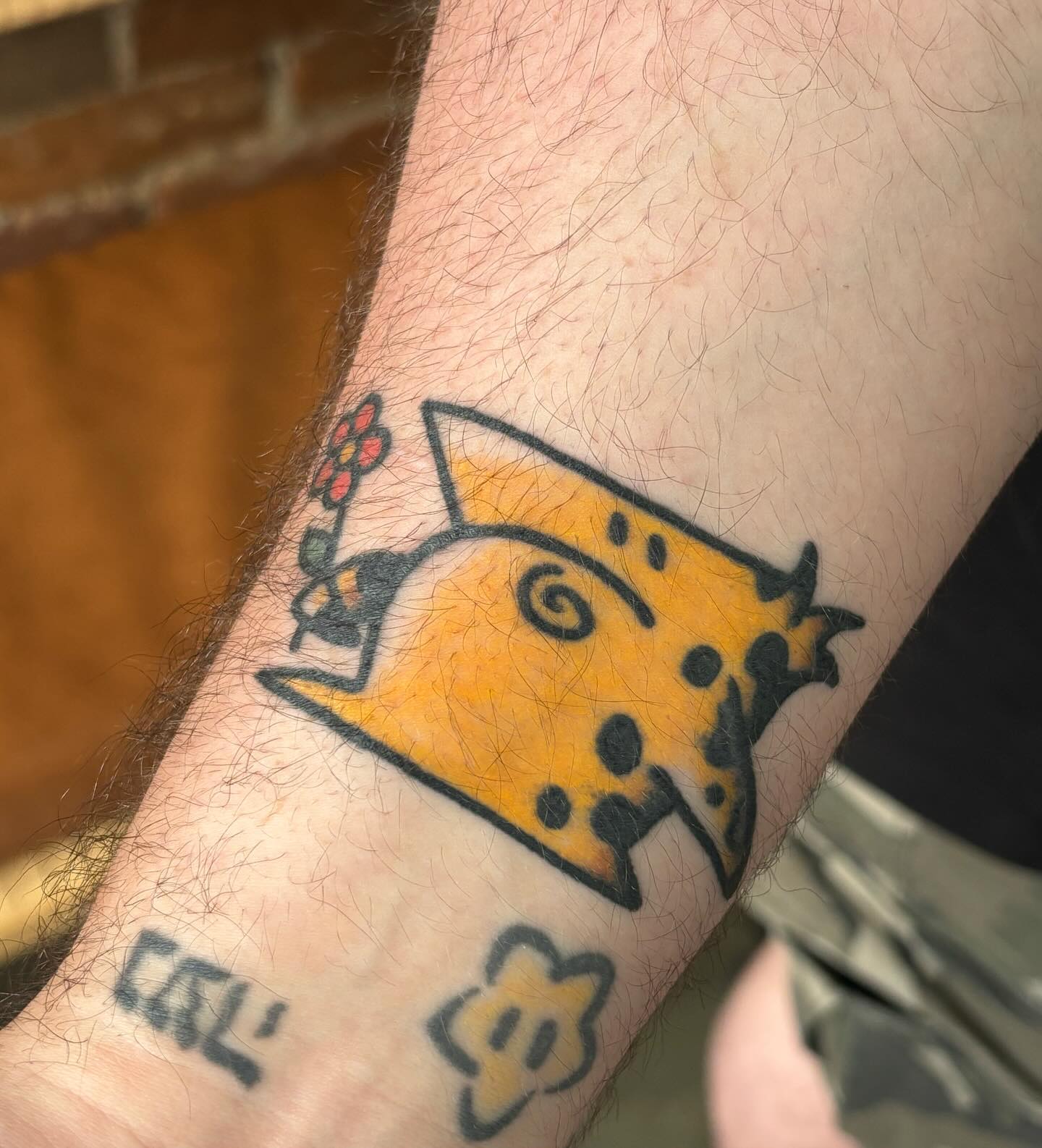 This tattoo showcases a playful slice of cheese holding a bright red flower, bringing a smile to anyone who sees it. The whimsical design adds a touch of charm, reminding people that tattoos can be fun and light-hearted. For those considering a unique tattoo, think about incorporating elements that reflect your personality and interests!