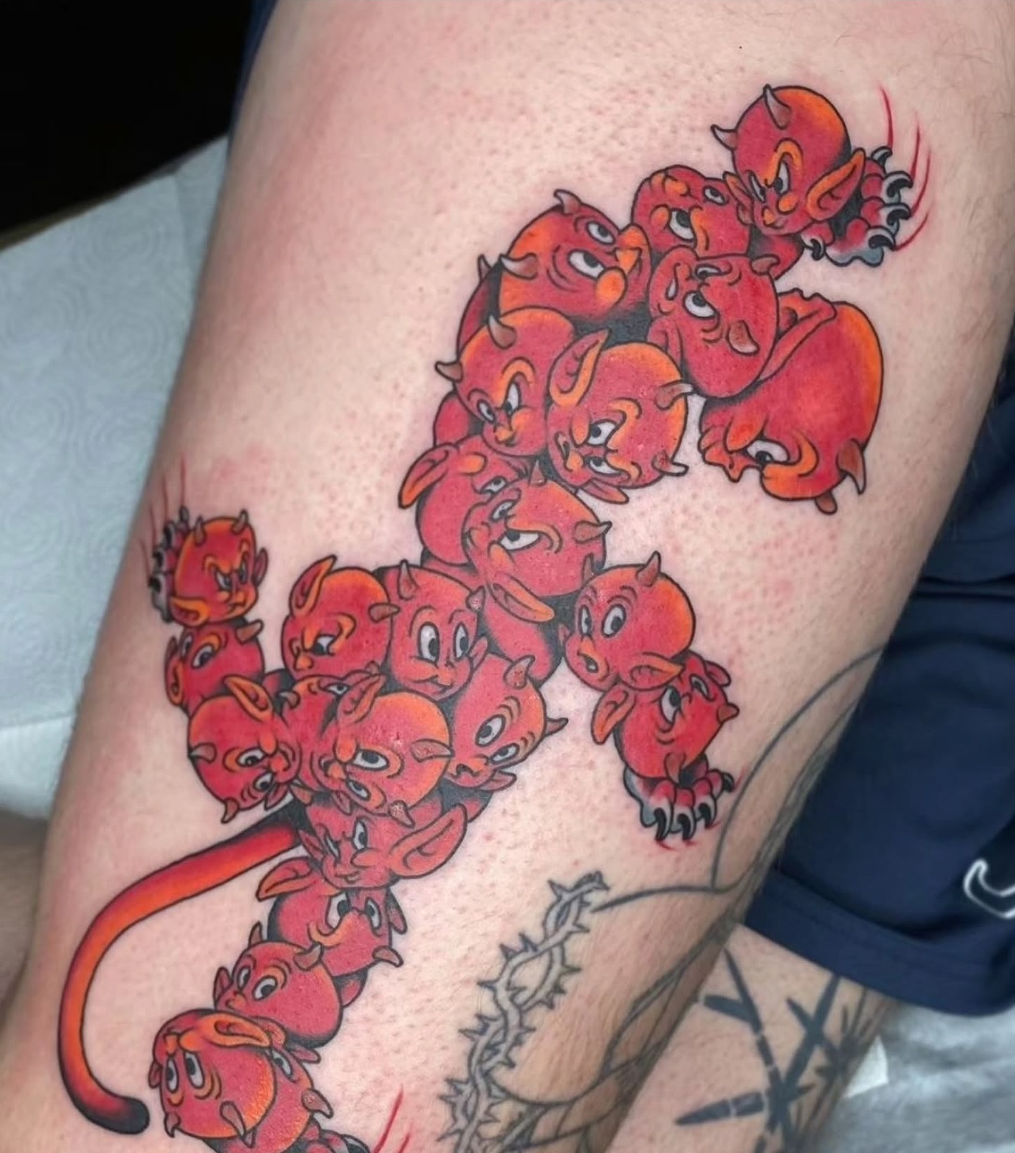 This tattoo showcases a playful pile of little red devils, all with quirky expressions and cheeky horns. Their vibrant colors and lively design create a fun and eye-catching piece of art that definitely stands out. When choosing a tattoo, it s always a good idea to pick something that reflects your personality or interests in a unique way!