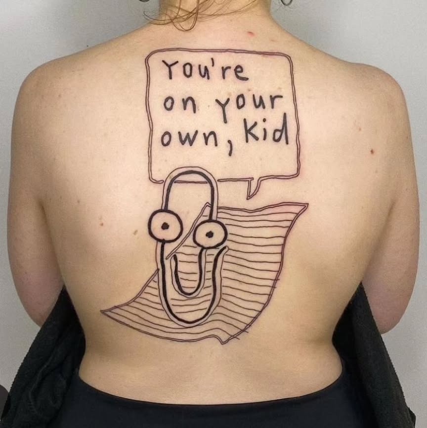 This tattoo features a playful paperclip character delivering a humorous message: “You’re on your own, kid.” It stands out for its quirky design and lighthearted vibe, turning an everyday object into a memorable piece of body art. For anyone considering a unique tattoo, embracing humor can be a fantastic way to express personality!