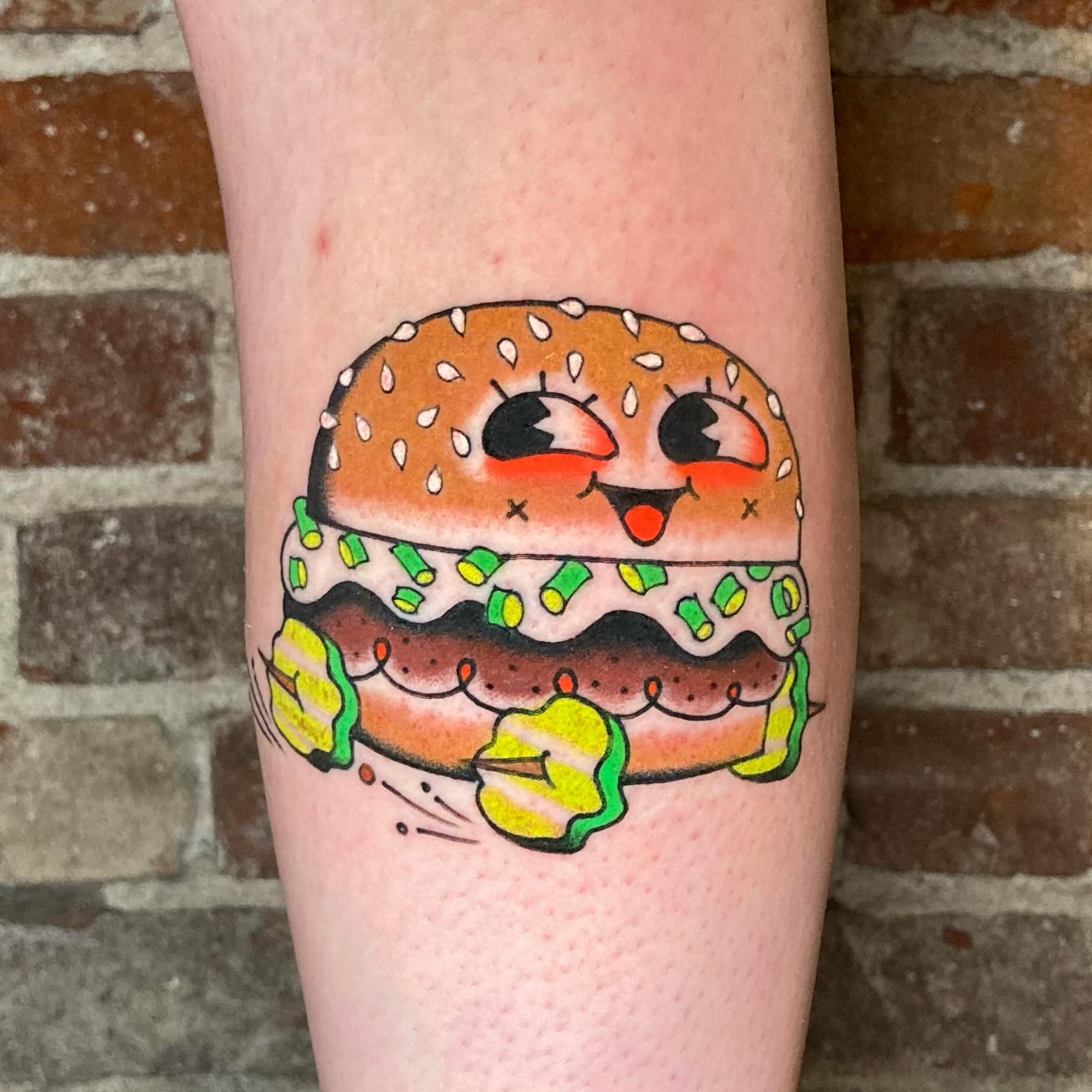 This charming tattoo features a happy, animated burger that looks ready to roll! With bright colors and a playful expression, it stands out as a delightful piece of body art. Food-themed tattoos can be a fun way to show off personal interests, so don t be afraid to embrace the weird and wonderful!