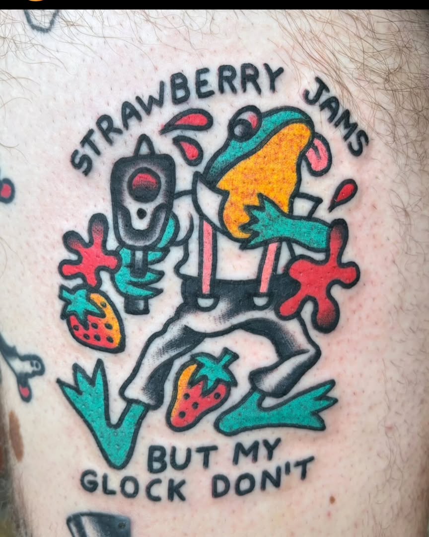 This tattoo features a lively frog dressed in suspenders and wielding a toy gun, all while surrounded by bright strawberries and playful splashes of color. The quirky phrase “Strawberry Jams But My Glock Don t” adds a humorous spin, making it a standout piece. For those considering a tattoo, embracing whimsy can lead to a truly unique design that sparks joy and conversation.