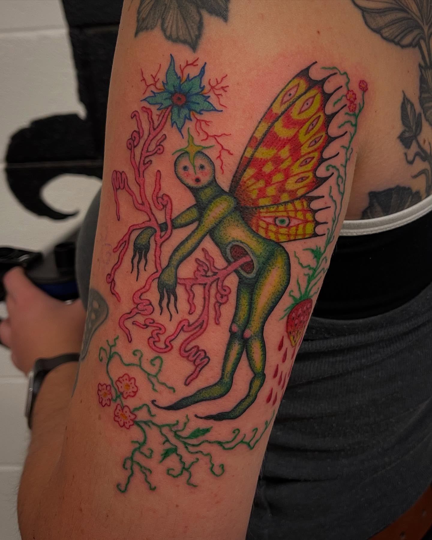 This tattoo features a whimsical creature with vibrant butterfly wings and a quirky, human-like form. The bold colors and intricate details create a lively scene that draws the eye, making it a standout piece. For anyone considering a unique tattoo, this design shows how creativity can turn the weird into something enchanting!