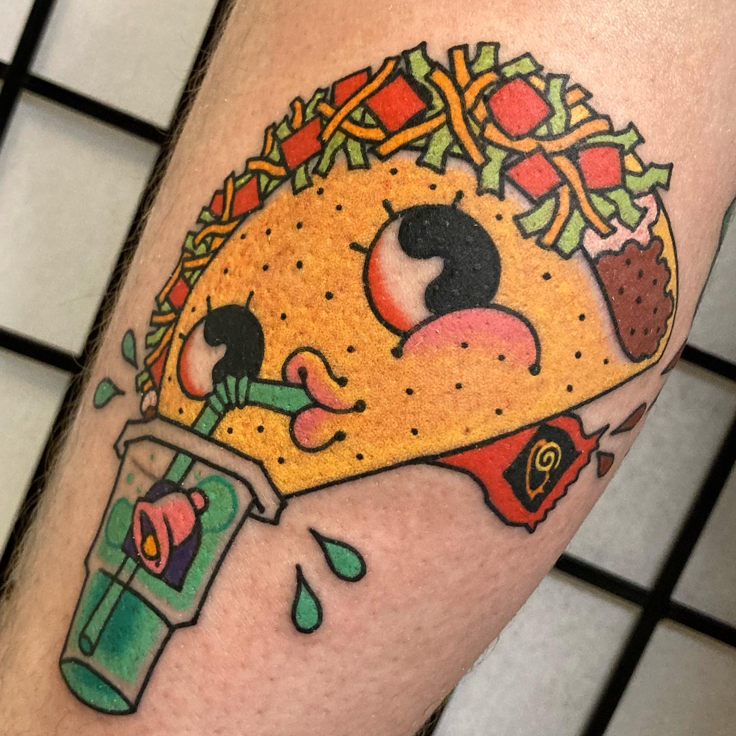 This tattoo features an animated taco with big, expressive eyes, sipping a drink through a straw. The colorful design brings a playful vibe, turning a simple food item into a unique piece of art. Food-themed tattoos like this one offer a fun way to express personality and interests, making them an unforgettable choice for some.