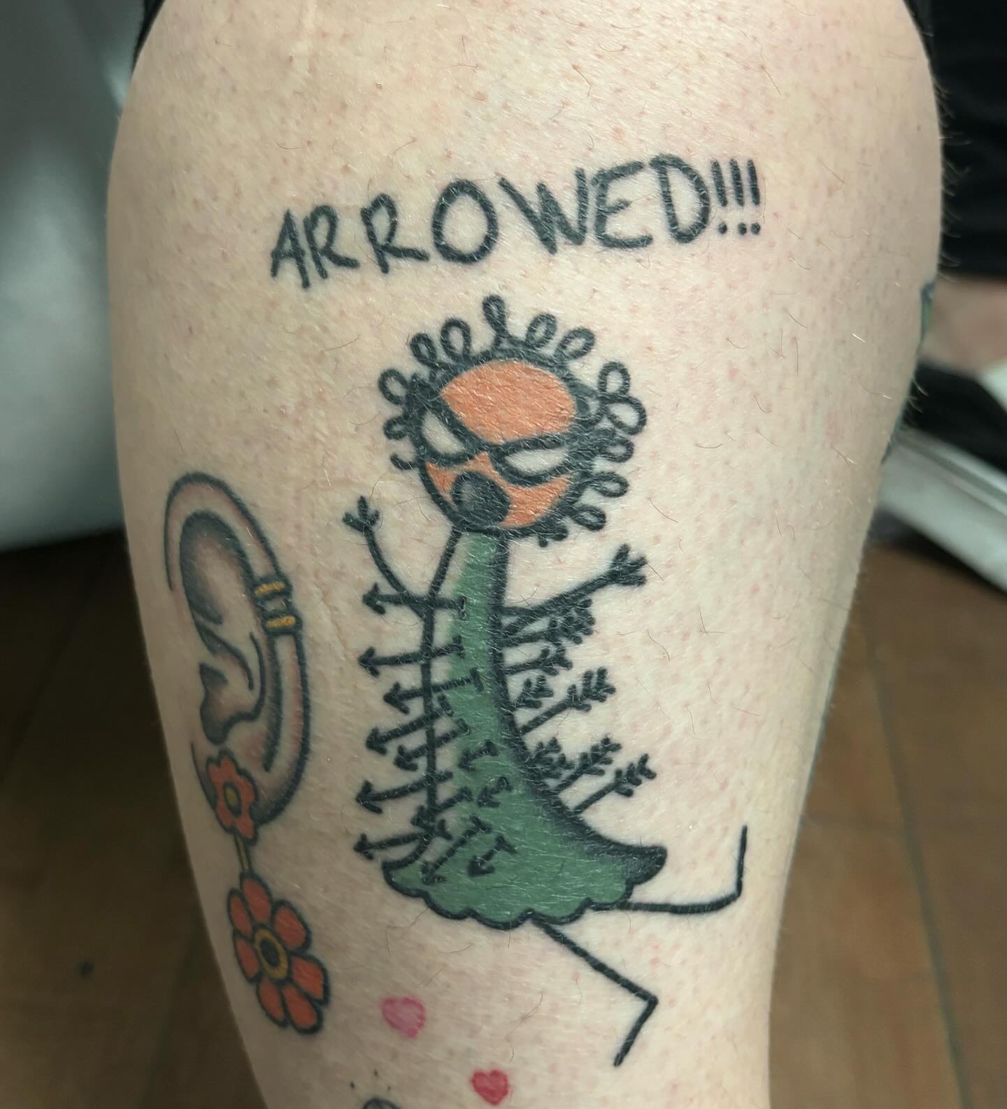 This tattoo features a whimsical character with an oversized head and a vibrant green dress, surrounded by arrows and charm. The playful design and humorous expression make it a standout piece, sparking curiosity and laughter. For those considering a unique tattoo, embracing a fun, cartoonish style can lead to a truly memorable design!