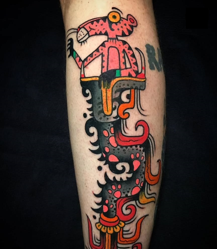 This tattoo features a vibrant, stylized creature sitting atop a swirling design, bursting with color. Inspired by ancient art, it tells a story of creativity and individuality that stands out on the skin. For those considering unique ink, choosing a design that reflects personal interests can make the tattoo even more special.