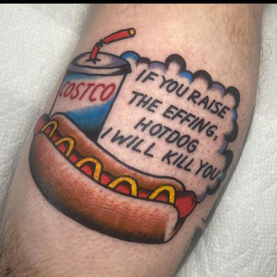 This tattoo stands out with its playful take on a classic hot dog and drink combo from Costco, featuring a humorous warning. The cheeky message adds a twist that captures both a love for food and a lighthearted sense of humor. For anyone considering a tattoo, remember that a little laughter can go a long way in making your ink truly unique!