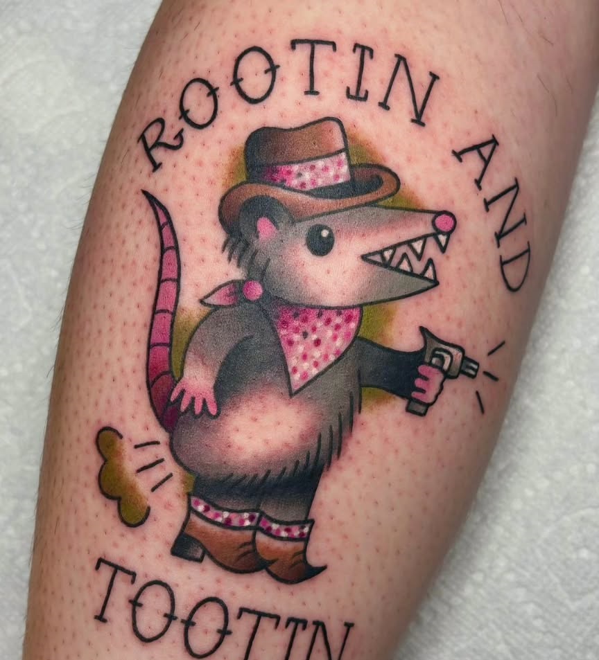 This tattoo features a playful opossum dressed as a cowboy, complete with a hat and a tiny gun. The design captures a whimsical spirit, showcasing how tattoos can blend humor and art in unexpected ways. For those considering a quirky tattoo, choosing a fun character can make your ink truly stand out.