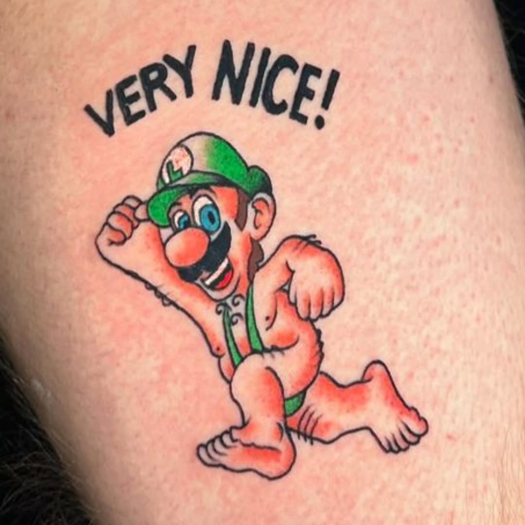 This tattoo features a playful, almost cartoonish Mario, joyfully running with a cheeky grin. The words “VERY NICE!” add an extra layer of humor, making it a delightful conversation starter. For those considering a similar design, embracing fun characters can bring a light-hearted touch to body art.
