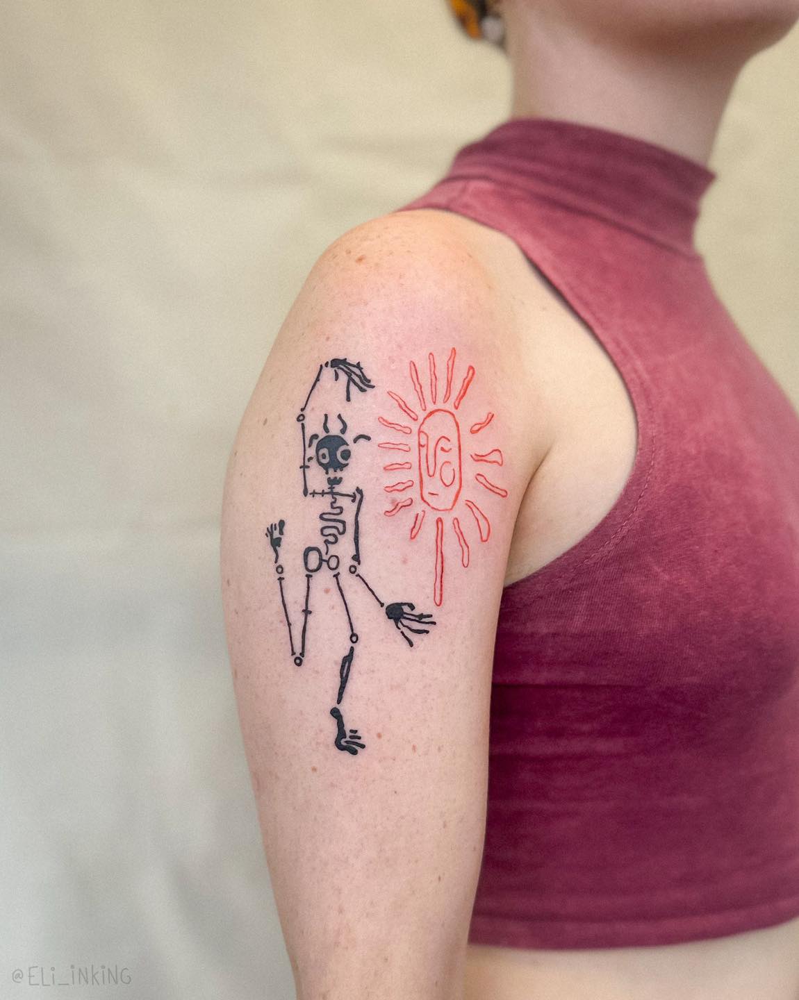 This tattoo stands out with its quirky combination of a skeleton and a bright sun. The playful design captures a blend of fun and creativity, making it a memorable piece of body art. For those considering unique tattoos, think about how different elements can come together to tell a story.