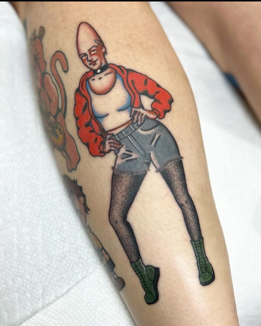 This tattoo showcases a unique character with an exaggerated head shape and a trendy outfit, making it a standout piece of body art. The playful design, complete with vibrant colors and quirky fashion choices, speaks to the wearer’s bold personality. For those considering a tattoo, think about how to express your individuality in a way that captures attention and sparks conversation.