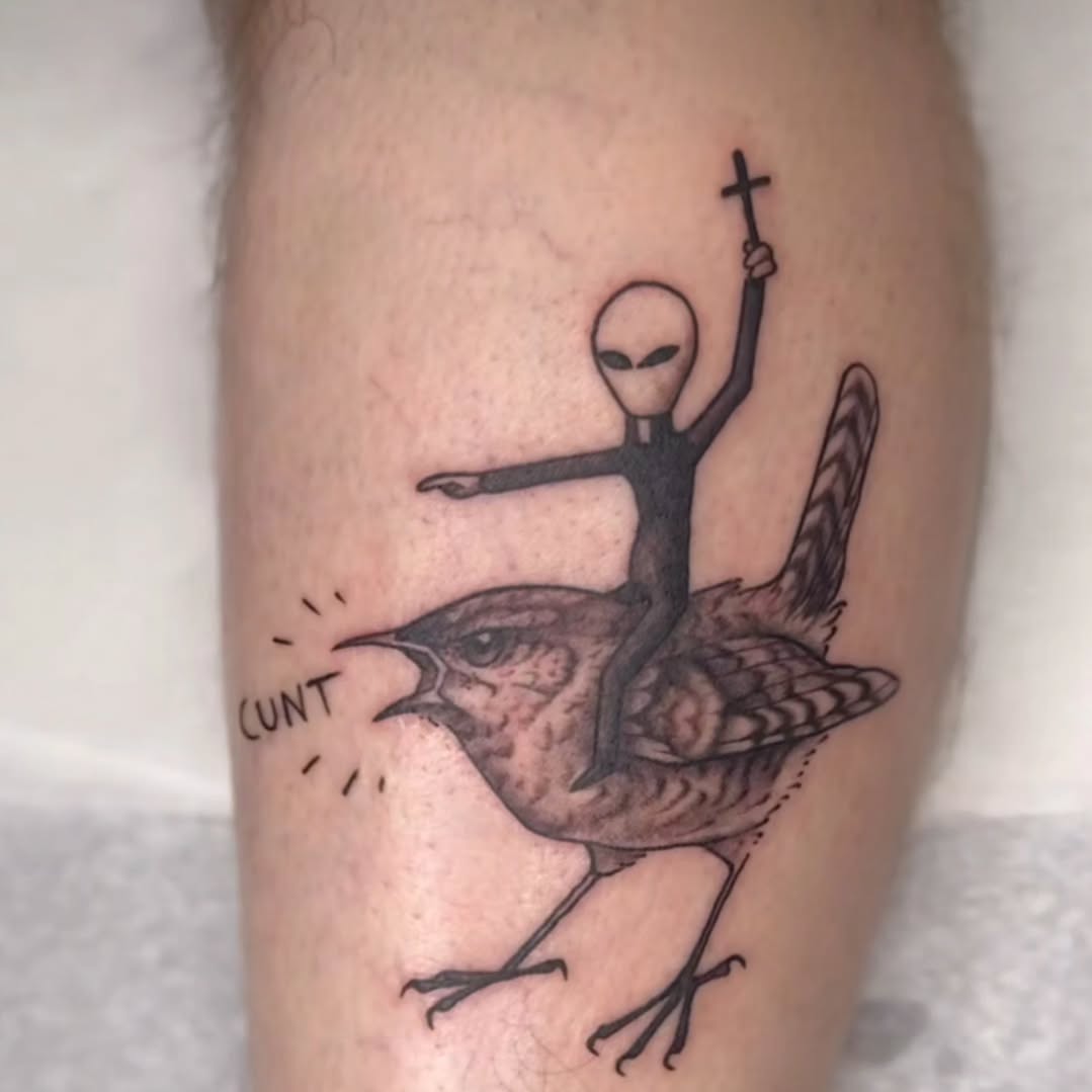 This tattoo features a quirky scene of an alien riding a bird while holding a cross, creating a unique blend of humor and imagination. It showcases how tattoos can tell unconventional stories, combining elements that one wouldn t typically see together. For those considering a distinctive tattoo, embracing your sense of humor can lead to truly memorable designs.