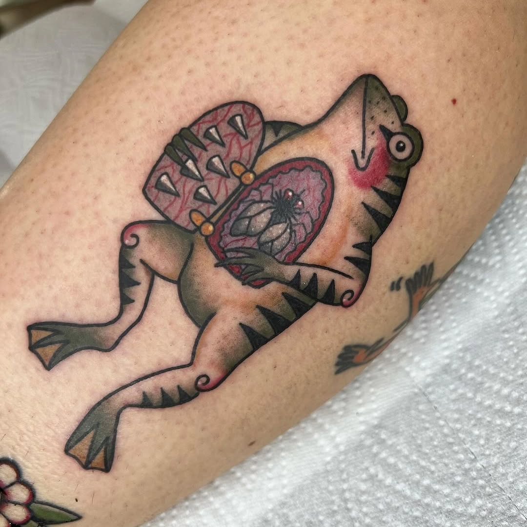 This tattoo showcases a vibrant, unusual creature that seems to leap off the skin. The bold colors and intricate details create a striking visual that captures attention immediately. For those considering a similar design, think about how unique imagery can express your personality and make a memorable statement.
