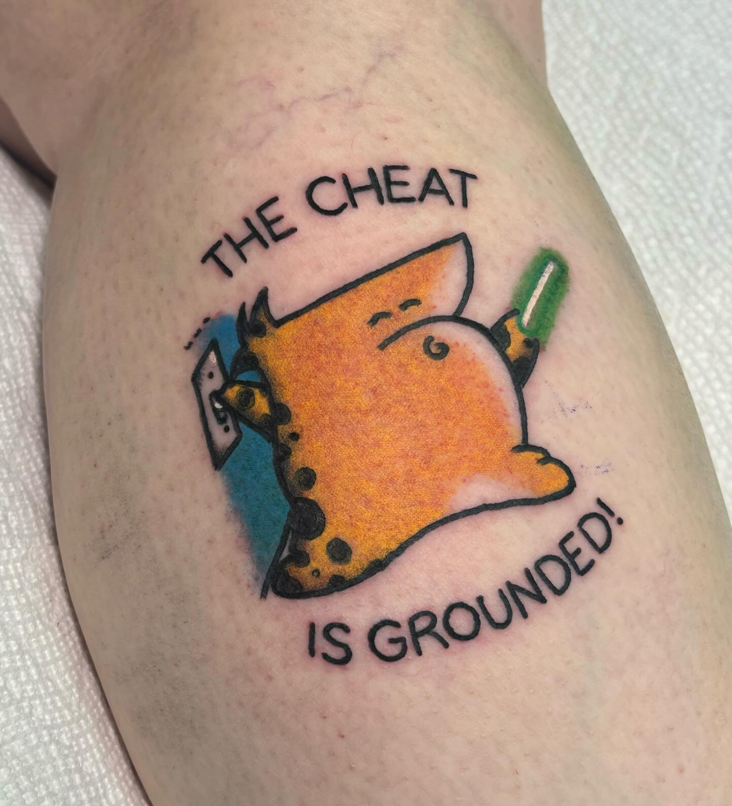 This tattoo features a playful character pulling a prank, complete with the cheeky phrase âTHE CHEAT IS GROUNDED!â It s a fun nod to cartoon antics that can spark laughter and conversation. For anyone considering quirky ink, choosing a design that reflects personal humor can make for a truly memorable tattoo experience.