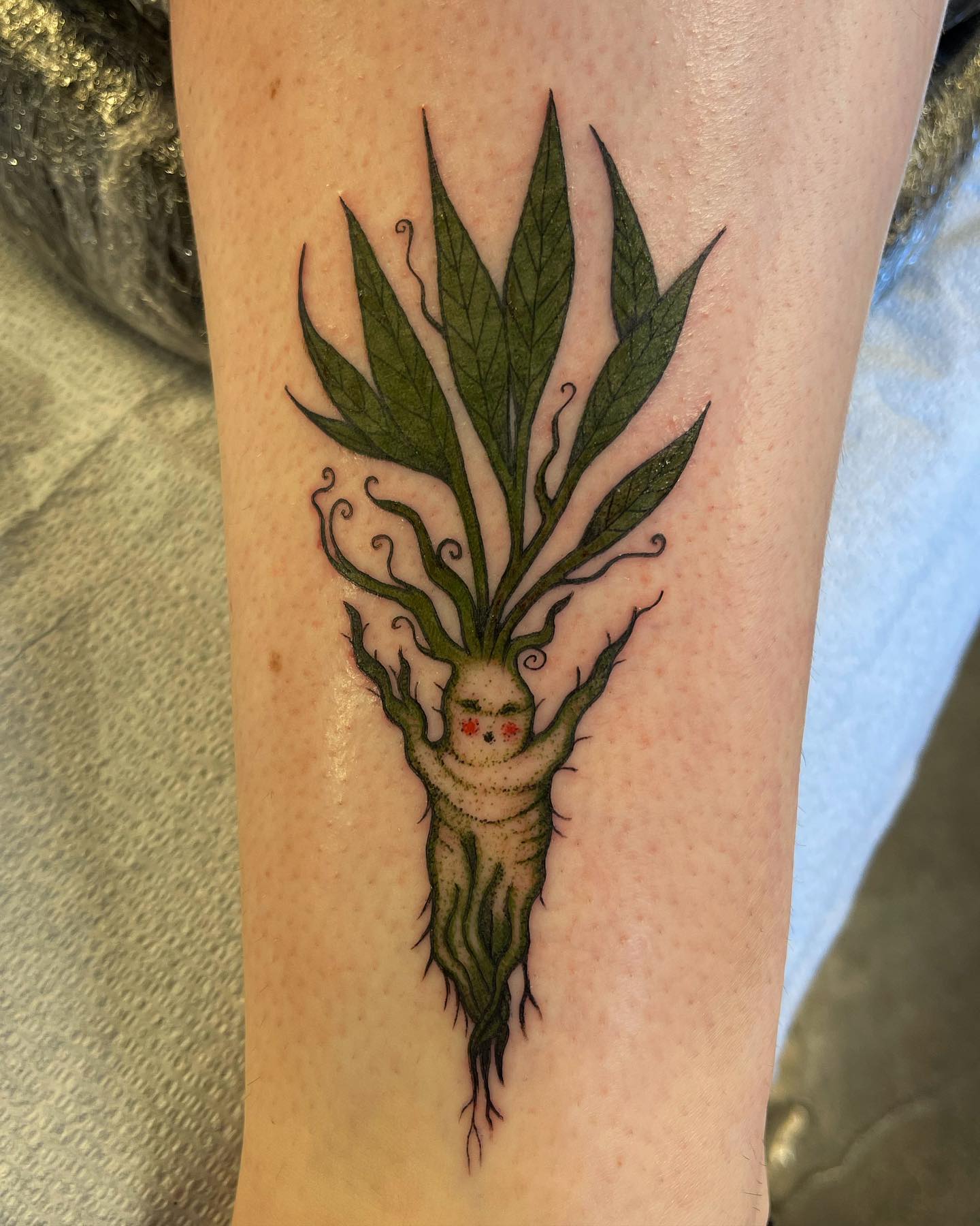 This tattoo showcases a whimsical plant creature with leafy arms and a cheerful expression. Its unique design blends nature and fantasy, making it a standout piece on the wearer s skin. For those considering a tattoo, think about how personal elements can bring your design to life.