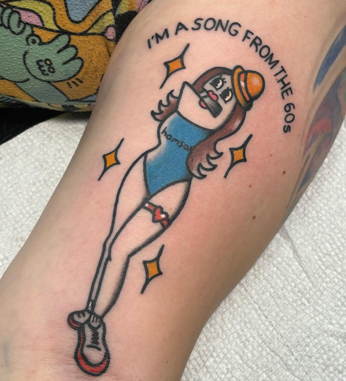 This tattoo features a playful character dressed in a retro swimsuit, complete with a vibrant hat and sparkling accents. The phrase âI m a song from the 60sâ adds a unique twist, making it a fun nod to the past. For those considering a quirky tattoo, think about how personal touches can tell your story in a delightful way!