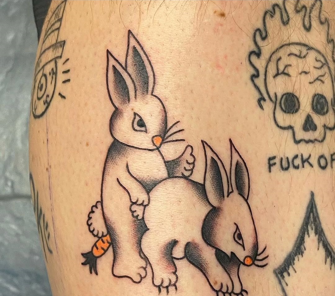 This tattoo features two cartoonish bunnies in a humorous and unexpected pose, making it both eye-catching and quirky. It s a playful take on animal behavior that surely raises eyebrows and sparks laughter among those who see it. For anyone considering a unique tattoo, embracing humor can be a great way to showcase personality!