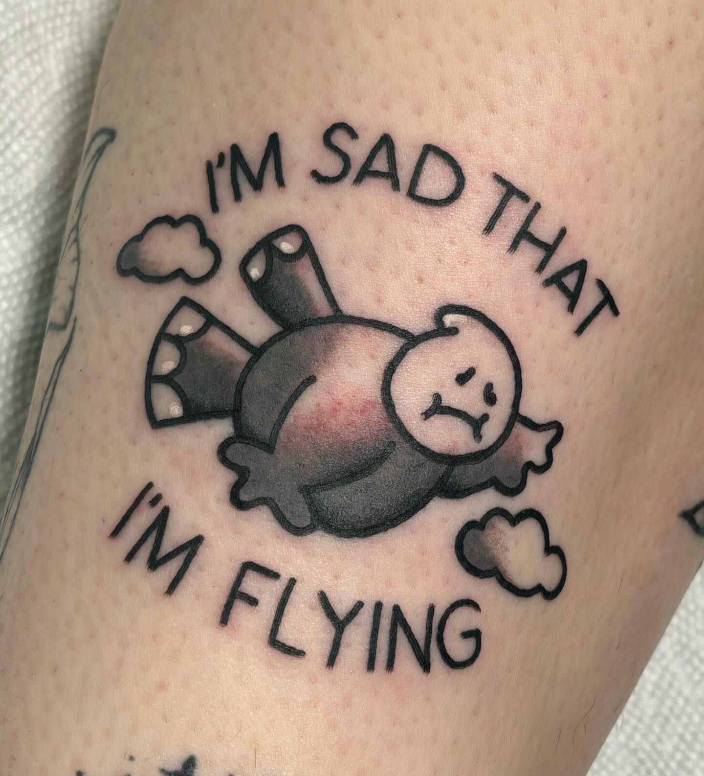 This tattoo features a cartoonish character soaring through the sky with a frown, capturing a unique mix of emotions. The quirky phrase “I m sad that I m flying” adds a humorous twist, highlighting how sometimes even joyful moments can feel bittersweet. It s a reminder that it’s okay to embrace all feelings, even the weird ones!