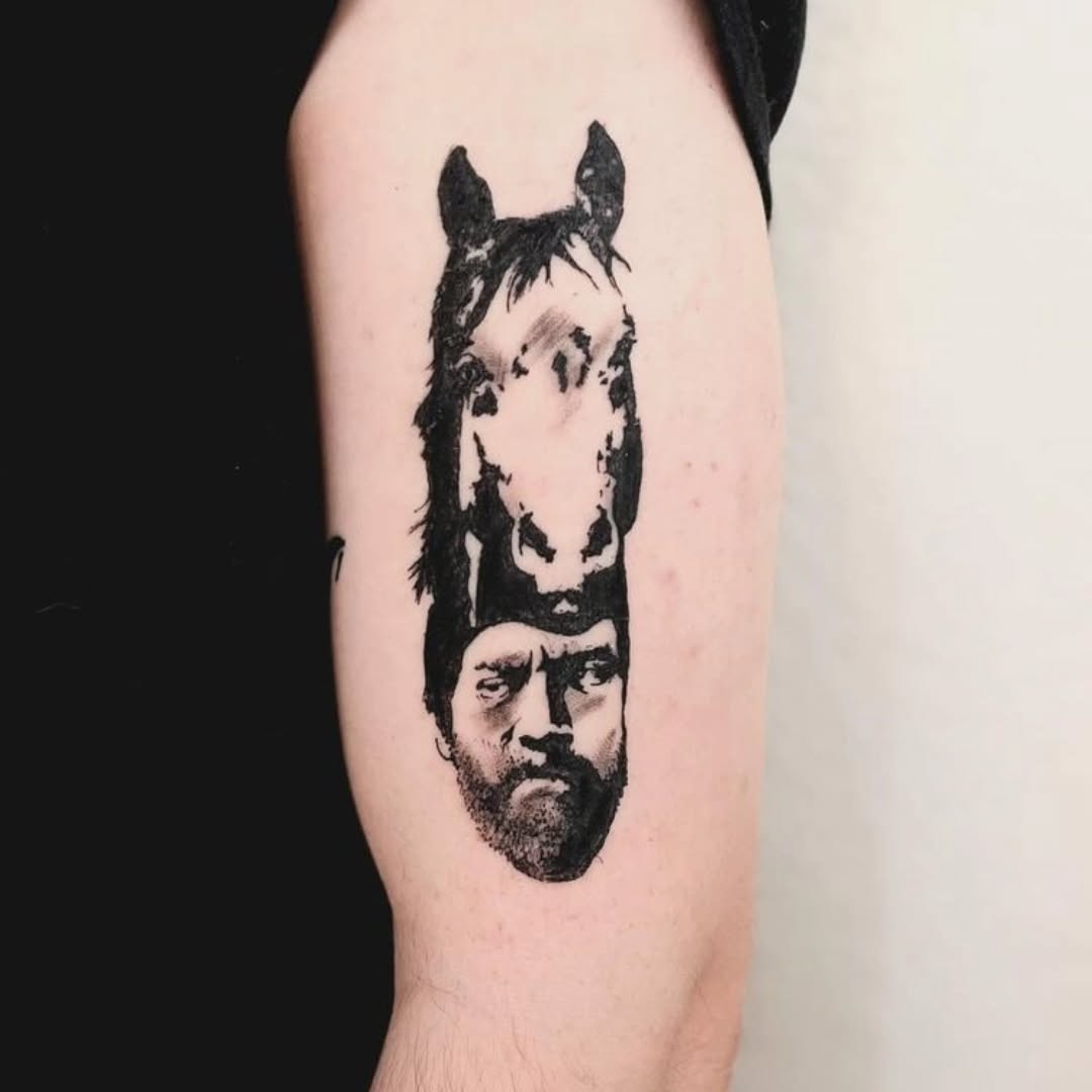 This tattoo features a striking image of a man’s face seamlessly blending into a horse’s head, creating a unique visual effect. The design raises eyebrows and sparks conversations, making it a perfect example of how tattoos can tell unusual stories. For anyone considering a one-of-a-kind tattoo, thinking outside the box can lead to truly memorable artwork.