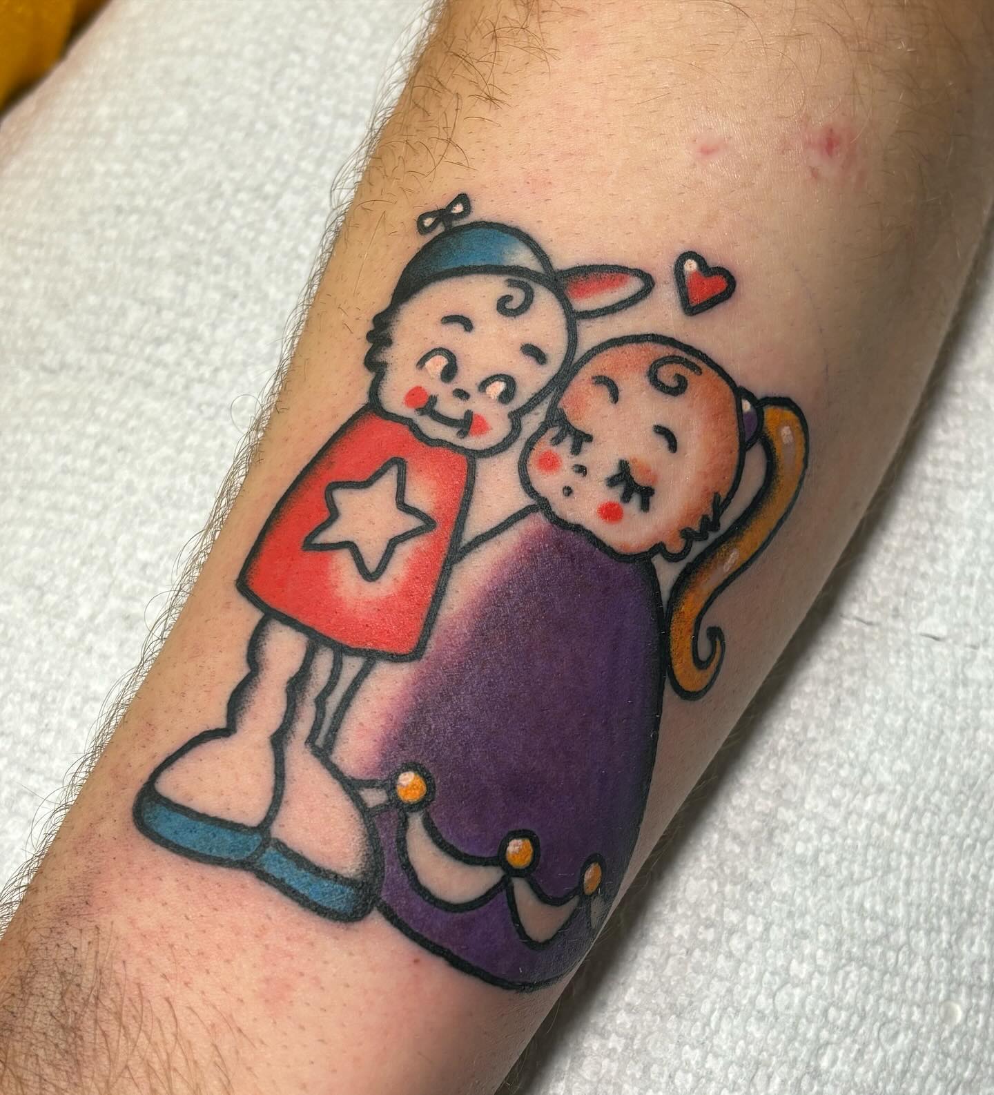 This tattoo features a delightful cartoon couple, radiating sweetness with their bright colors and joyful expressions. The playful design showcases a nostalgic charm that brings smiles to those who see it. For anyone considering a tattoo, choosing something that reflects personal happiness can make it even more special!