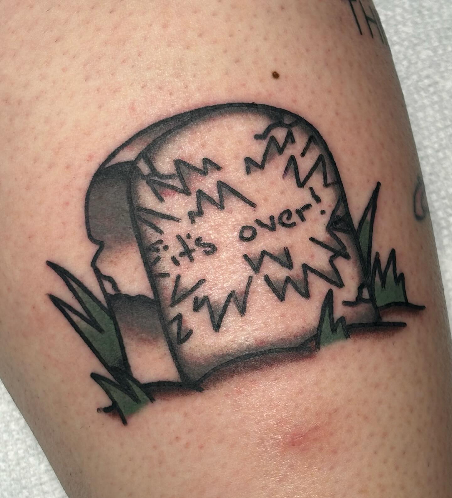 This tattoo features a quirky tombstone with the words “it’s over!” boldly etched on it, making a humorous statement about endings. It captures a playful take on closure, perhaps symbolizing a breakup or a significant life change. For those considering unique ink, remember that a touch of humor can make a lasting impression.