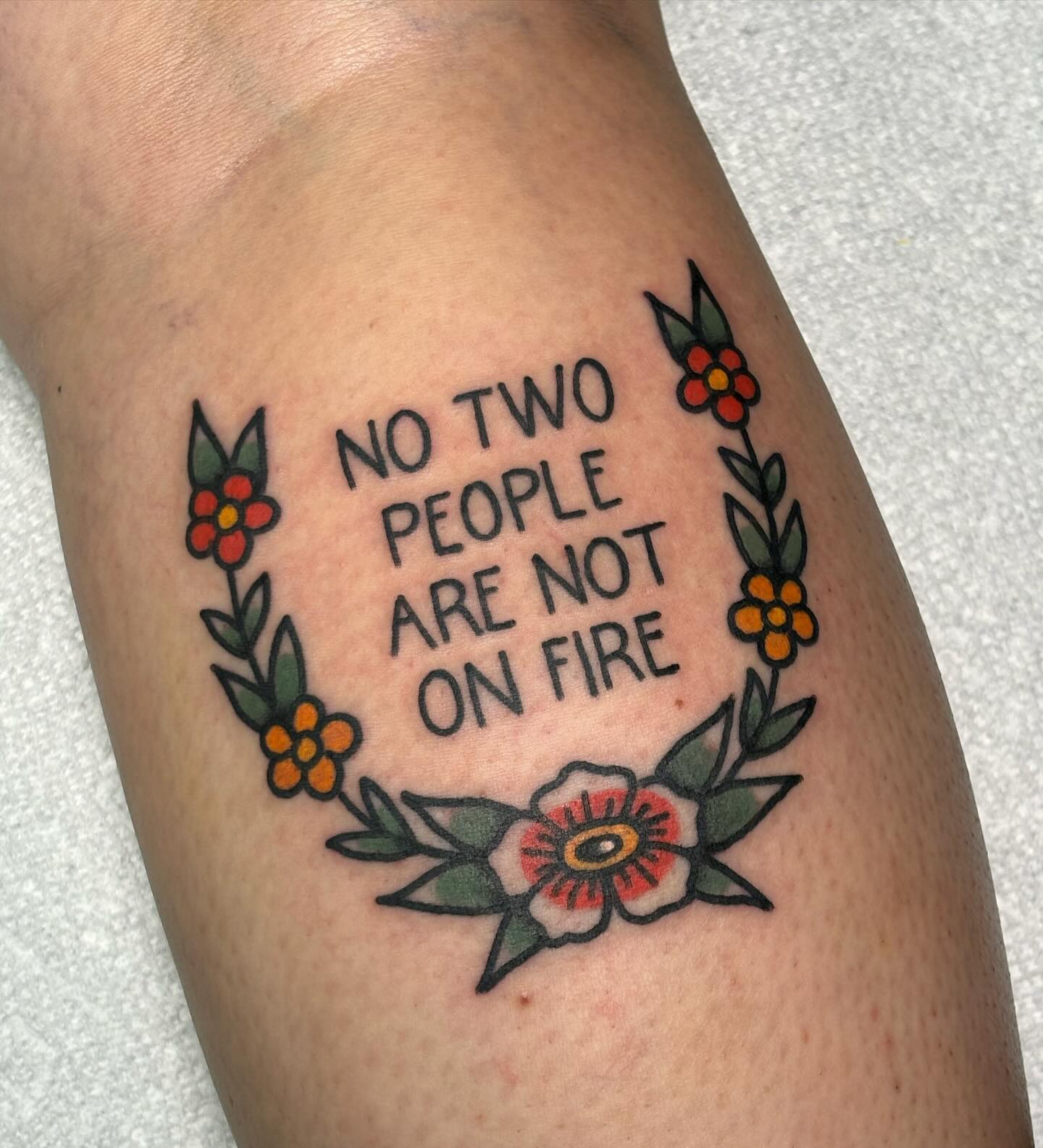 This tattoo features a quirky phrase surrounded by colorful flowers, making it both eye-catching and thought-provoking. The message, “No two people are not on fire,” sparks curiosity and invites conversation about individuality and connection. When choosing a tattoo with words, consider how it reflects your personality or beliefs, turning your skin into a canvas of self-expression.