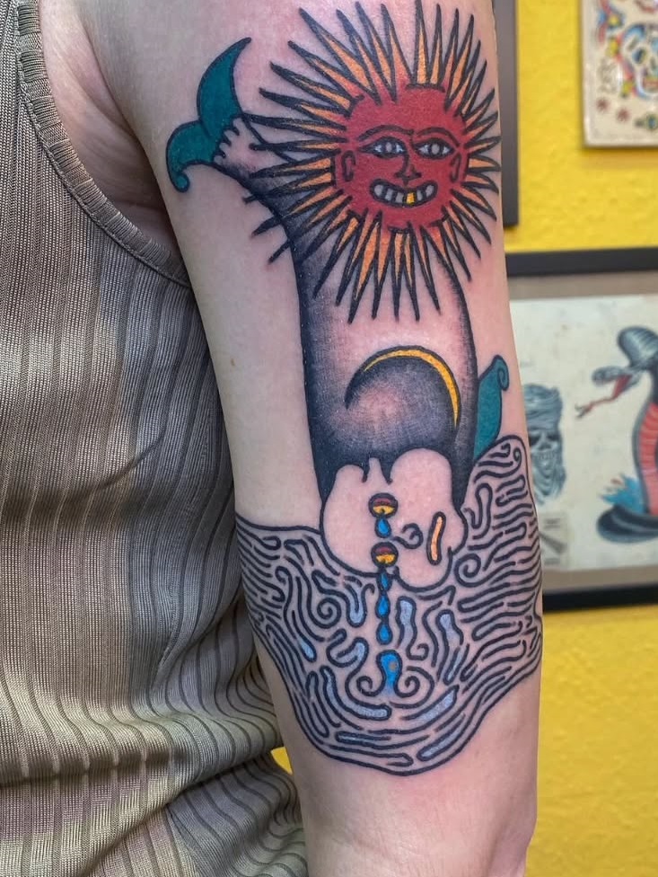 This tattoo stands out with its quirky blend of bright colors and imaginative imagery. Featuring a smiling sun above a maze-like design, it sparks curiosity and invites questions about its meaning. For those considering unique body art, embracing creativity and personal stories can lead to truly memorable tattoos.