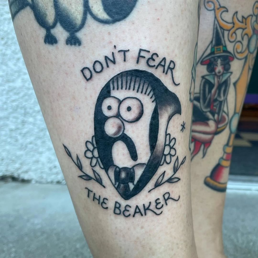 This tattoo features Beaker, the beloved character from “The Muppet Show,” with the quirky phrase “Don’t Fear the Beaker” above him. It captures his comical essence, making it an eye-catching piece that sparks joy and conversation. For those considering a unique tattoo, choosing a character that resonates with personal memories can make the design even more special.