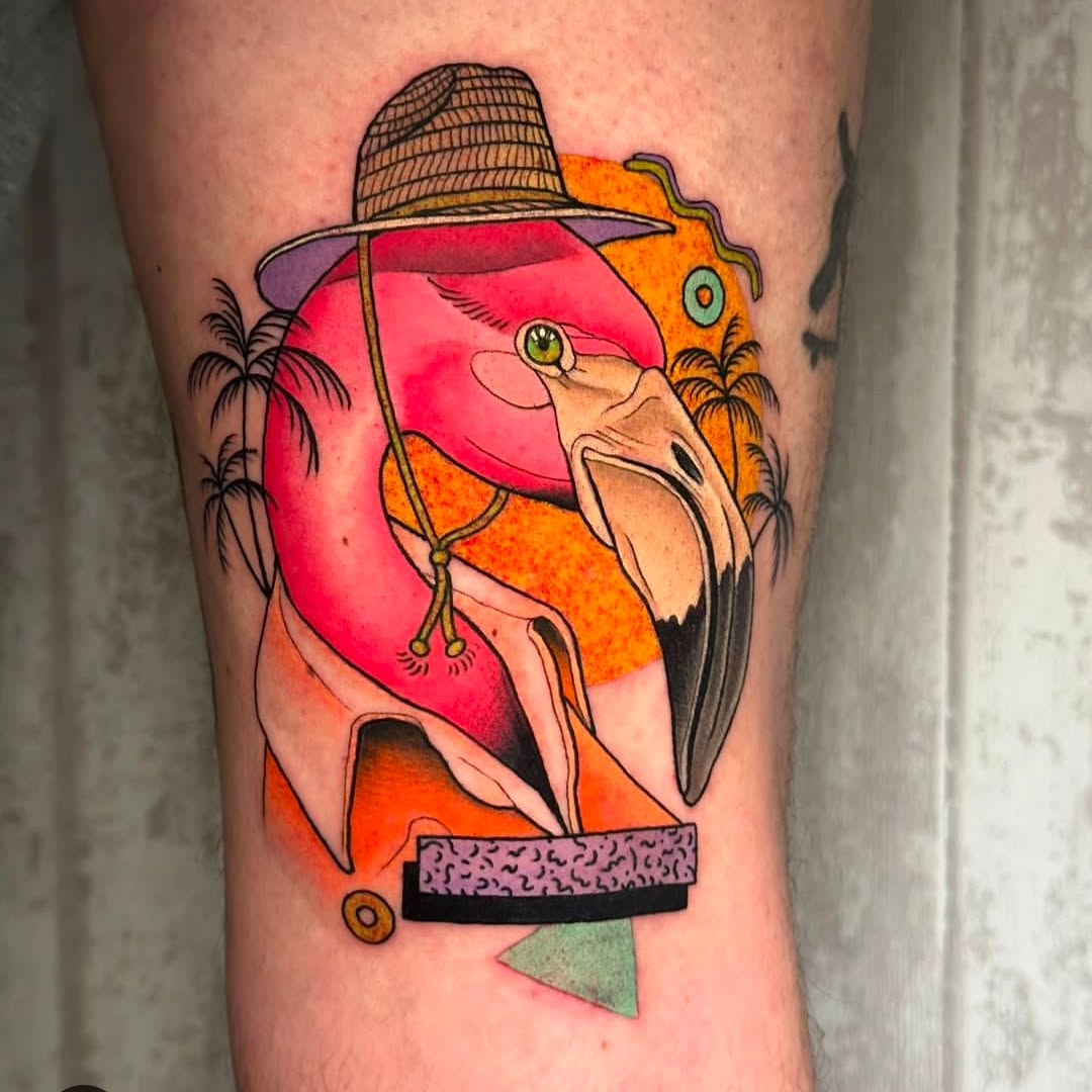 This tattoo features a vibrant pink flamingo wearing a stylish hat, perfectly blending fun and creativity. The background pops with warm colors and tropical elements, making it a delightful piece of art. For those considering unique tattoos, this design shows how playful imagery can bring a light-hearted touch to body art.
