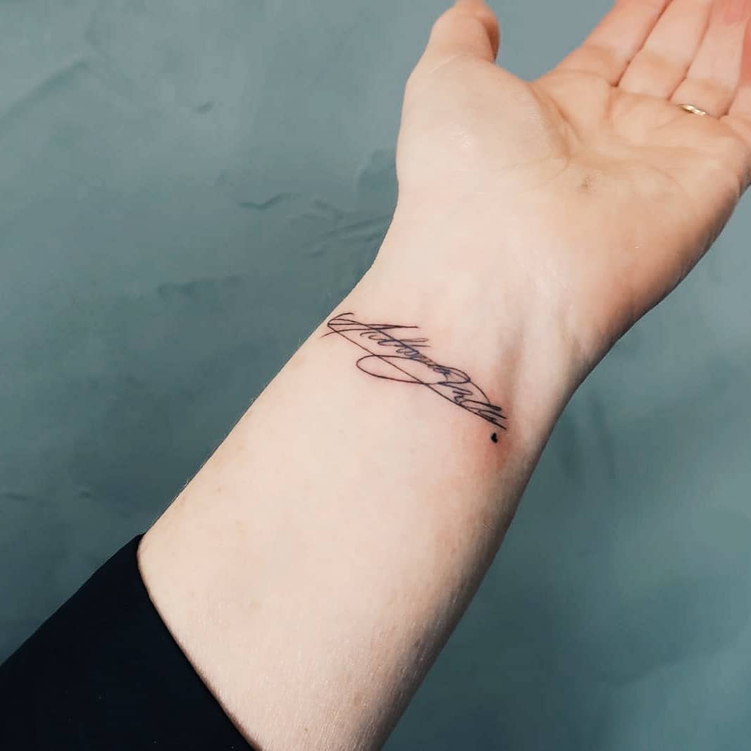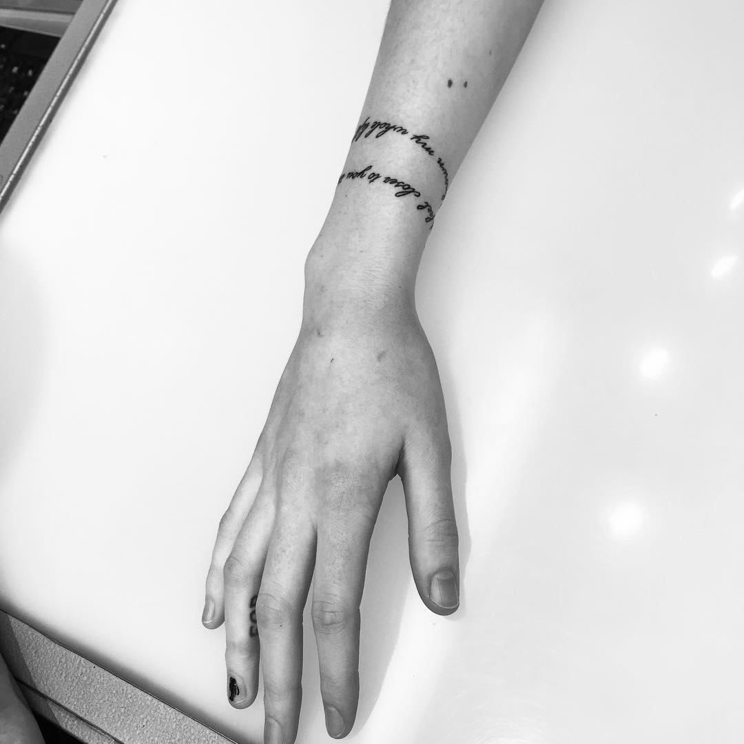 This image captures a delicate wrist tattoo featuring a graceful script, adding a touch of elegance to the wearer s arm. The flowing words wrap around the wrist, creating a personal and meaningful piece of art. Choosing a simple yet impactful design can make a wrist tattoo both timeless and versatile.