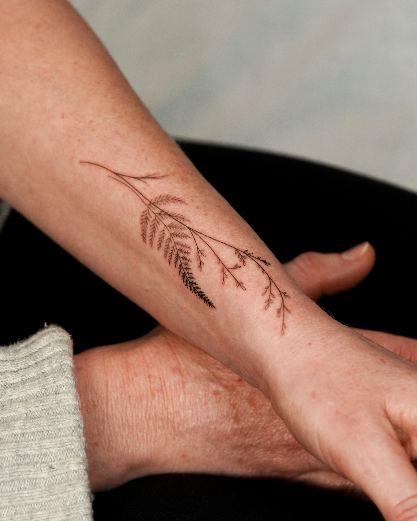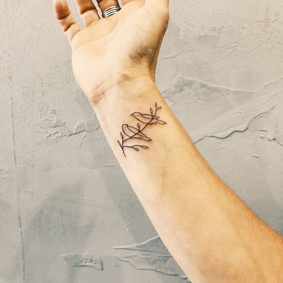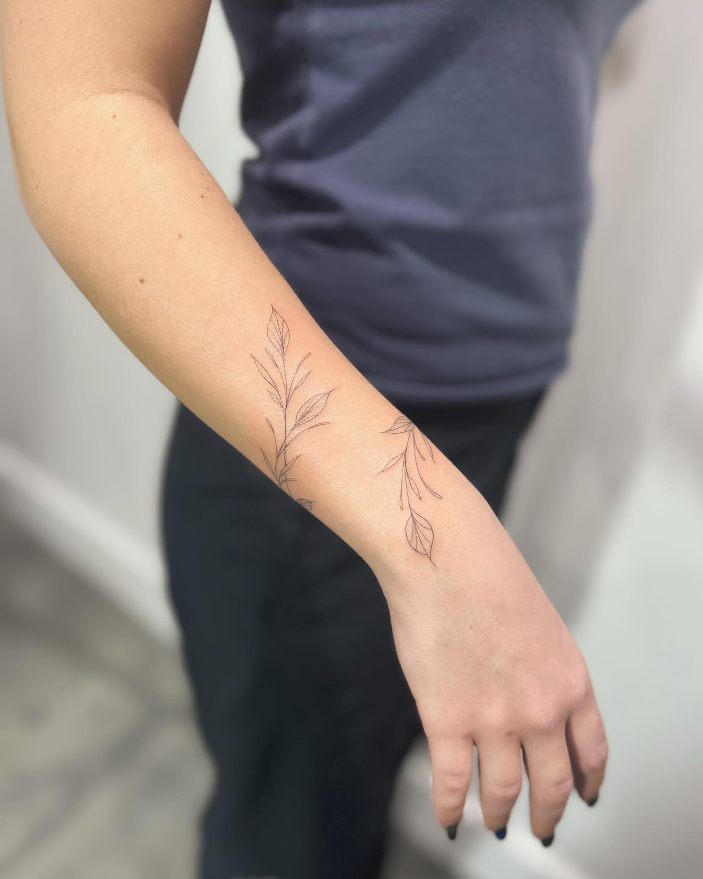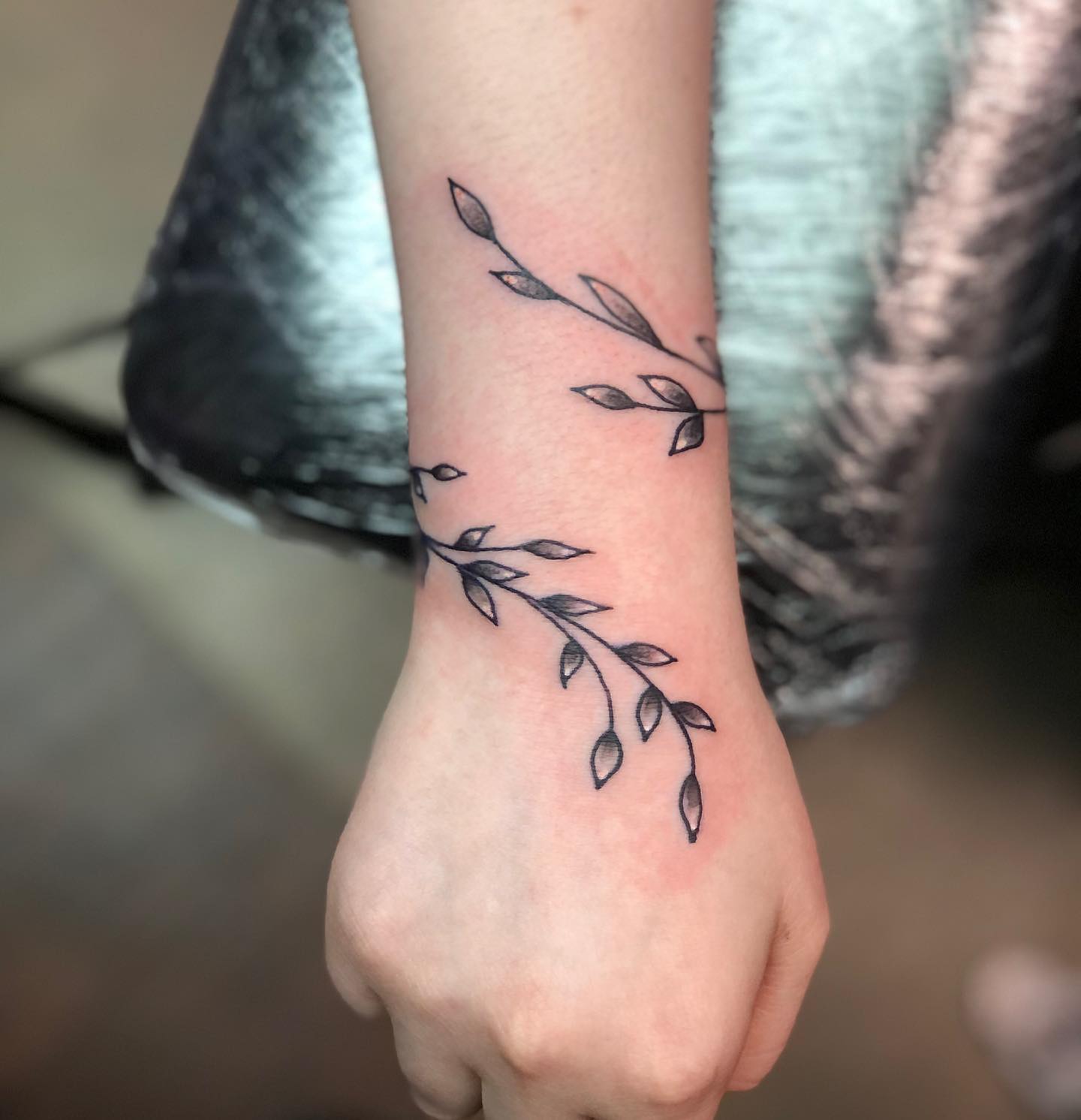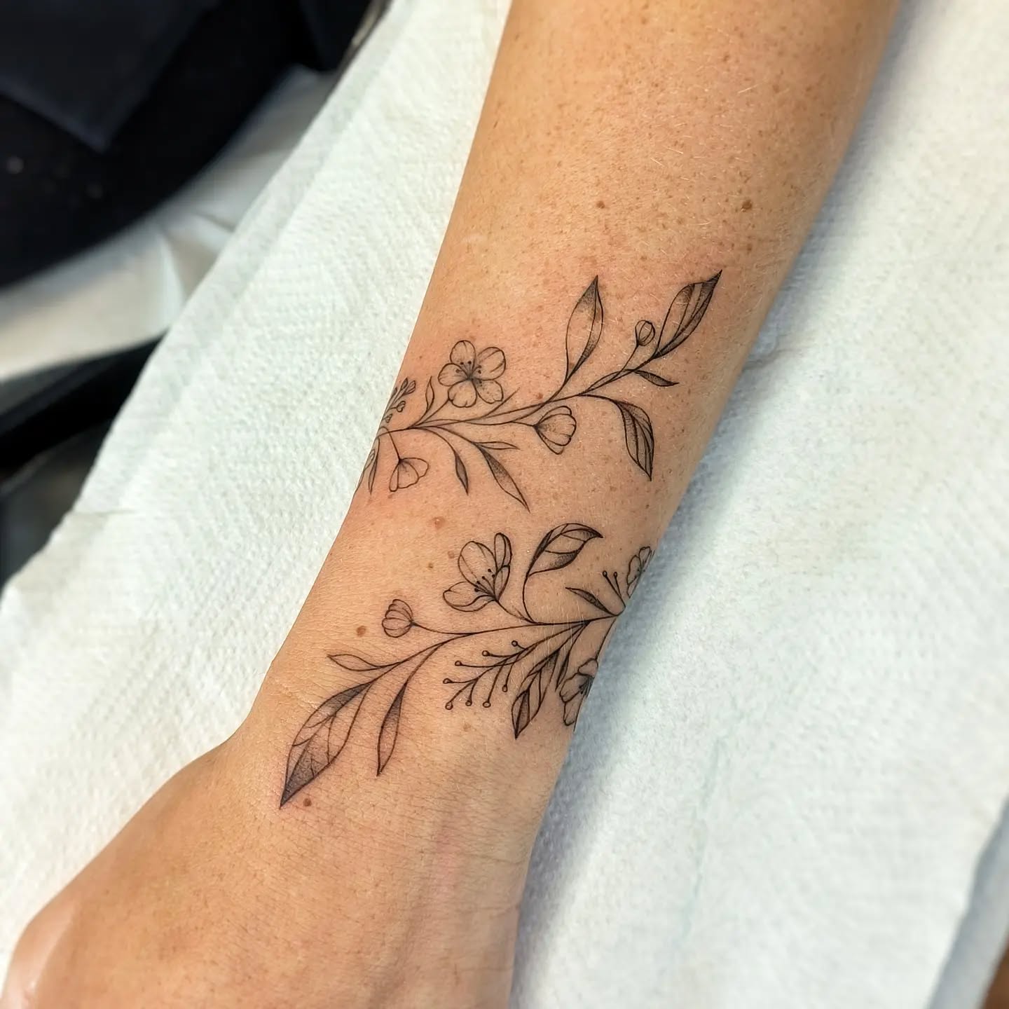 This wrist tattoo captures the delicate beauty of nature with a simple yet elegant design. The fine lines of the branches and leaves create a sense of serenity, making it a perfect choice for those who appreciate subtle art. Wrist tattoos like this one can serve as a gentle reminder of the beauty found in simplicity.