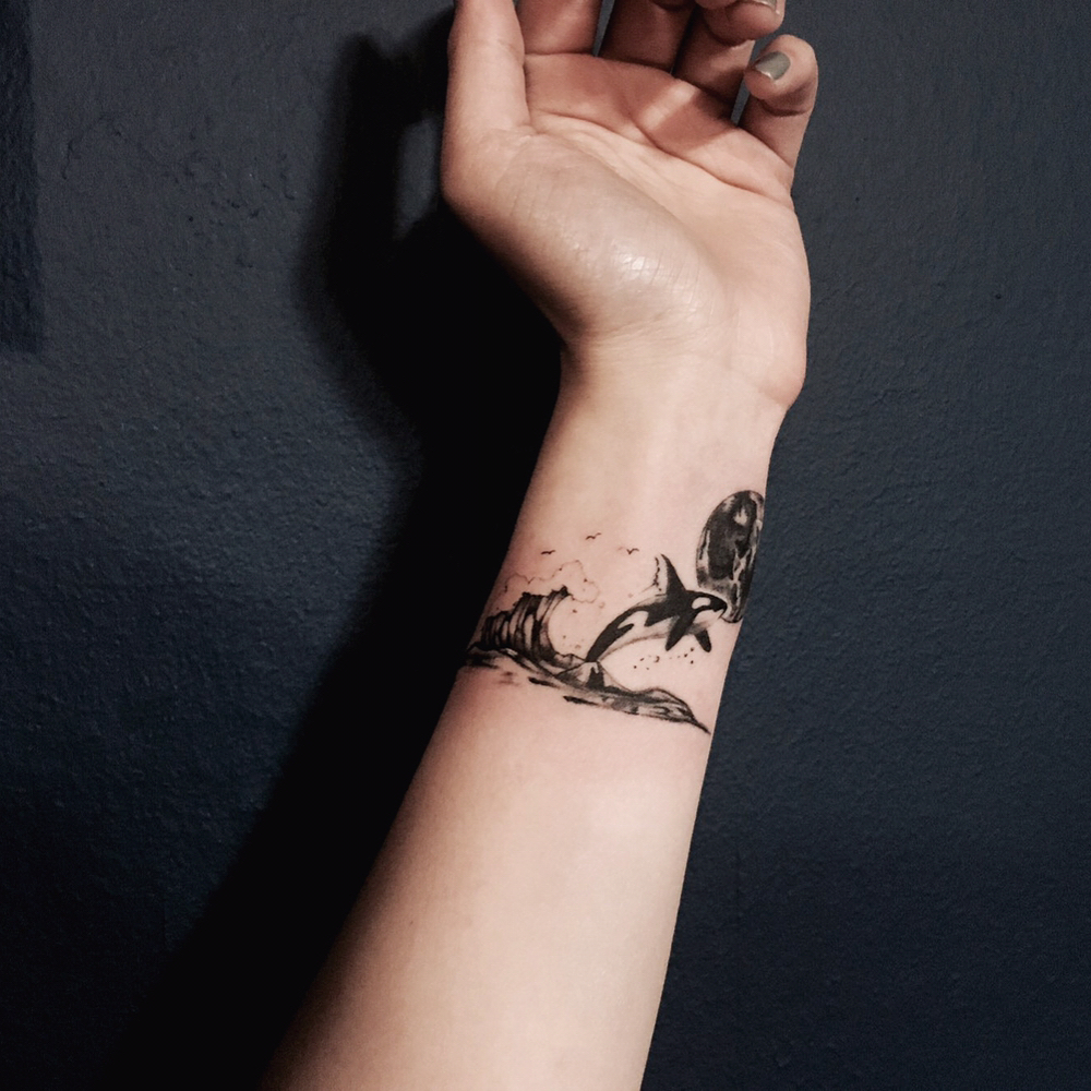 This wrist tattoo showcases a dynamic scene of an orca leaping through ocean waves, set against a dark backdrop. The detailed artwork brings to life the beauty and power of the sea, making it a perfect choice for ocean lovers. Choosing a theme that resonates personally can make a wrist tattoo feel even more meaningful and unique.